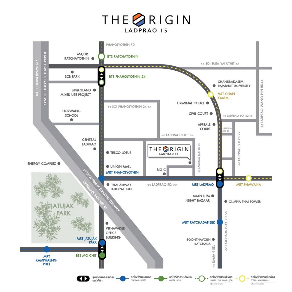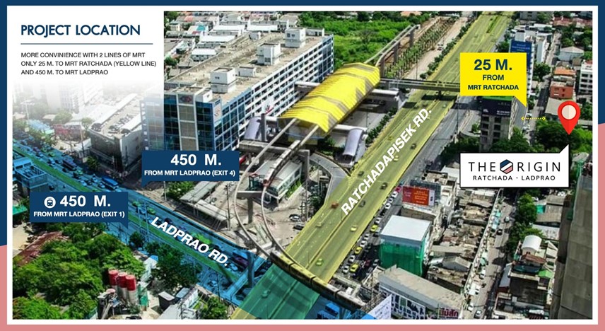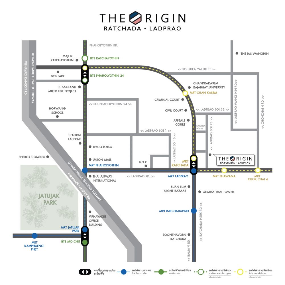 - เชื่อมต่อการ เดินทางด้วยรถไฟฟ้า 2 สาย สายสีเหลือง สถานีรัชดาเพียง 25 เมตร และสายสีน้ำเงิน สถานีลาดพร้าว เพียง 450 เมตร
