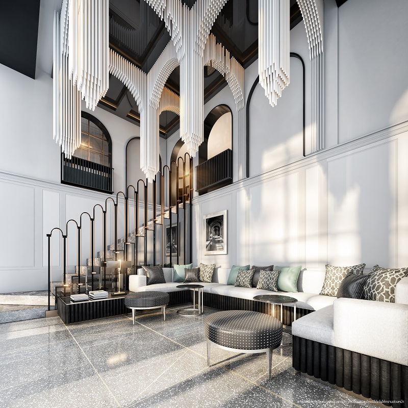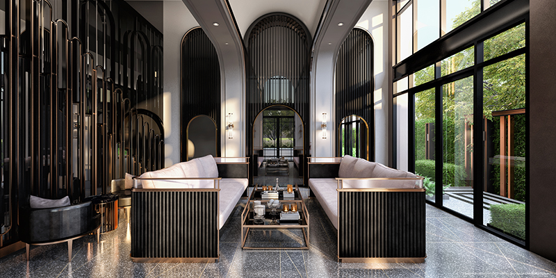 ขณะที่ส่วนกลางที่เป็นไฮไลท์ก็จะมี Lobby Double Volume Space เปิดมุมมองสู่สวนสีเขียวด้วยกระจกสูงเต็มตา