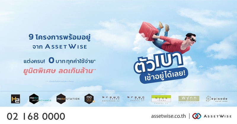 บริษัท แอสเซทไวส์ จำกัด ผู้พัฒนาอสังหาริมทรัพย์ที่มุ่งมั่นสร้างสรรค์ที่อยู่อาศัยคุณภาพ ส่งมอบความเร้าใจกับโปรโมชั่น "ตัวเบา...เข้าอยู่ได้เลย" สำหรับลูกค้าที่สนใจเป็นเจ้าของโครงการพร้อมอยู่ ทั้ง 9 โครงการของแอสเซทไวส์ ด้วยข้อเสนอสุดพิเศษ ทั้งตกแต่งแบบครบครัน ฟรีทุกค่าใช้จ่ายวันโอน* และพิเศษสุด ๆ กับยูนิตราคาพิเศษ ลดเกินล้าน เริ่มต้นเพียง 1.99 ล้านบาท ตั้งแต่วันที่ 15 ก.ค. ถึง 31 ก.ย. ศกนี้