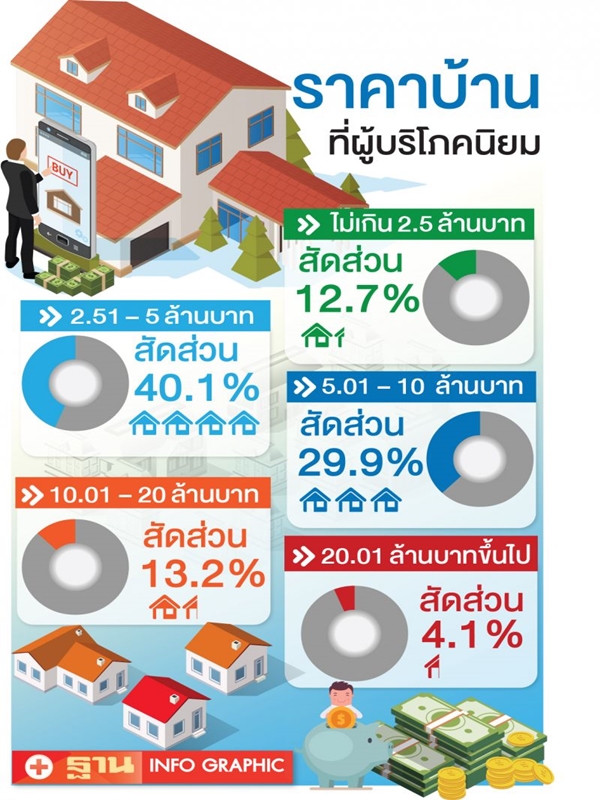 สำหรับ ระดับราคาบ้านที่ผู้บริโภคให้ความนิยม ได้แก่ 2.51-5 ล้านบาท มีสัดส่วนสูงที่สุด 40.1% รองลงมาคือบ้านระดับราคา 5.01-10 ล้านบาท 29.9% บ้านระดับราคา 10.01-20 ล้านบาท 13.2% ส่วนบ้านระดับราคาไม่เกิน 2.5 ล้านบาท มีสัดส่วน 12.7% และ บ้านระดับราคา 20.01 ล้านบาทขึ้นไป มีสัดส่วน 4.1% โดยตัวเลขดังกล่าวค่อนข้างแสดงให้เห็นว่าบ้านระดับกลางถึงบน มีกำลังซื้อที่หนาแน่นสุด เนื่องจากกลุ่มเป้าหมายกลุ่มนี้ได้รับผลกระทบทางเศรษฐกิจที่ไม่มากนัก