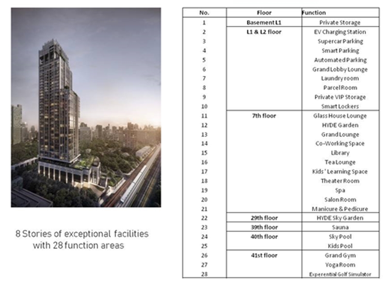 เพียงแค่ 250 เมตรจากสถานีรถไฟฟ้าทองหล่อ พื้นที่ส่วนกลางแบบเต็มรูปแบบ มากถึง 8 ชั้น 28 ฟังก์ชั่น ซึ่งวันนี้ได้คัดสรรการบริการด้านฮอสพิทอลลิตี้ระดับโลกให้ผู้อยู่อาศัยในโครงการ “ไฮด์ เฮอริเทจ ทองหล่อ” (HYDE Heritage Thonglor) โดย บริษัท เวเลอร์ ฮอสพิทอลลิตี้ พาร์ทเนอร์ส (Valor Hospitality Partners) ซึ่งเป็นบริษัทที่มีประสบการณ์ทั้งใน อังกฤษ สหรัฐอเมริกา ดูไบ และ เอเชียแปซิฟิก เพื่อยกระดับการบริการในโครงการให้มี World Class Hospitality Services อย่างแท้จริง