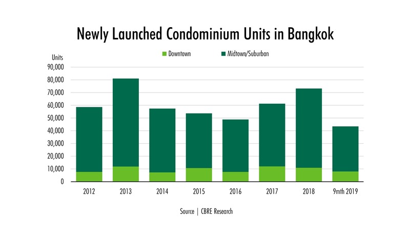 ซีบีอาร์อี บริษัทที่ปรึกษาด้านอสังหาริมทรัพย์ชั้นนำเปิดเผยว่า ด้วยหลายปัจจัยไม่ว่าจะเป็นการเติบโตทางเศรษฐกิจที่ชะลอตัว หนี้ครัวเรือนที่สูง และปริมาณที่พักอาศัยที่เพิ่มขึ้น ทำให้ปี 2562 เป็นปีที่มีความท้าทายอย่างยิ่งสำหรับตลาดที่พักอาศัยในกรุงเทพมหานคร ผู้พัฒนาโครงการต่างชะลอการเปิดตัวโครงการใหม่เนื่องจากความเชื่อมั่นในตลาดที่ลดลง นอกจากนี้ ยอดขายลูกค้าต่างชาติก็ได้รับผลกระทบจากการที่เงินบาทแข็งค่าและการเติบโตของเศรษฐกิจโลกที่ชะลอตัว โดยเฉพาะยอดขายจากผู้ซื้อชาวจีน