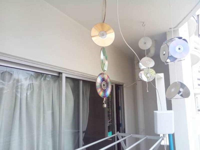 ไอเดียยอดนิยมที่เห็นแนะนำกันทั่วไปบนอินเตอร์เน็ตเลยครับนั่นก็คือการนำซีดีเก่า ๆ มาแขวนไว้ที่ระเบียงให้มันหมุนไปหมุนมาสะท้อนแสงวิบวับ ๆ โดยหวังว่าจะให้นกพิราบเห็นแล้วตกใจบินหนีไปหรือไม่กล้าบินเข้ามา จะได้ไม่เข้ามาเกาะหรือทำรังที่ระเบียงของเรา ... แต่ผมบอกเลยว่าวิธีนี้อาจได้ผลแค่ช่วงแรกครับ นกพวกนี้มันฉลาด สักระยะหนึ่งเจ้าพิราบตัวแสบจะเริ่มรู้แล้วว่าไอ้เจ้าซีดีแขวนโง่ ๆ นี่ทำอะไรมันไม่ได้หรอก เมื่อถึงเวลานั้นแล้วล่ะก็เตรียมหาทริคอื่นได้เลยครับ อึพิราบเต็มระเบียงแน่นอน