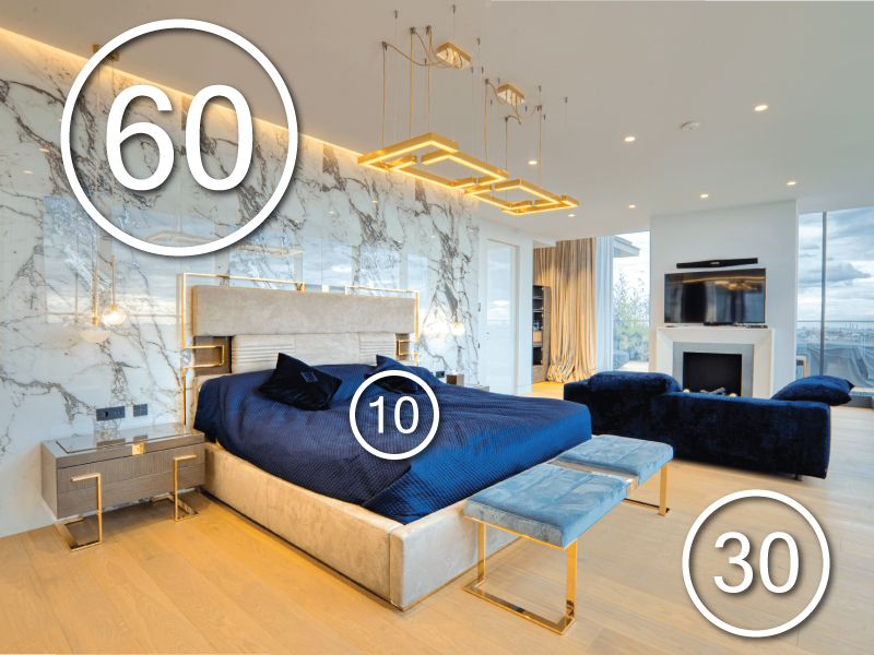 ในด้านการใช้สี มันมีสิ่งที่เรียกว่า "กฎ 60:30:10" อยู่ครับ เป็นกฎที่ควบคุมความสมดุลของการแต่งห้องได้อย่างดีเลย โดยตามกฎนี้เราสามารถใช้สีได้ 3 สีครับ โดยสีแรกจะใช้พื้นที่ประมาณ 60% ของห้องทั้งหมด จึงเหมาะกับการเป็นสีพื้นใช้ทาบนกำแพง สีต่อมาจะเป็นสีรองที่เอาไว้ตัดเลี่ยนกับสีแรก จะกินพื้นที่ประมาณ 30% ของห้อง และไม่โดดเด่นมากนัก อาจใช้เป็นสีของตู้โชว์ริมผนัง หรือสีบนพื้นก็ได้ครับ ส่วนอีก 10% สุดท้ายถือเป็นสีเด่นของห้องครับ ควรใช้กับสิ่งที่จะเป็นจุดเด่นอย่างชุดโซฟากลางห้อง โคมไฟดีไซน์เก๋ หรือชุดหมอนอิงบนโซฟาก็ได้ ... เท่านี้เราก็สามารถคุมโทนให้ไปในทางเดียวกันได้แล้วครับ
