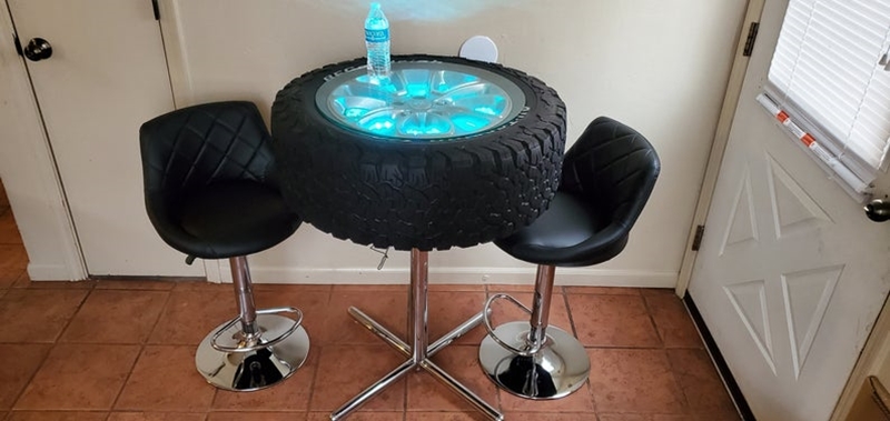 บ้านใครมีแขกมาเยี่ยมเป็นประจำหรือชอบฟีลนั่งบาร์ล่ะก็ ไอเดียนี้น่าจะเข้ากับคุณเลยครับ เป็นการนำยางรถยนต์เส้นใหญ่พร้อมแม็ก มาติดขาตั้งด้านล่างและกระจกด้านบน ใส่ไฟตรงกลางให้ดูมีสีสันหน่อย วางคู่กับเก้าอี้บาร์แบบปรับระดับได้ ผมบอกเลยว่ามันเข้ากันมาก ทั้งเท่และมีสไตล์ มองแล้วไม่รู้สึกแปลกแยกเลยครับ ถ้าอยู่กับสไตล์ลอฟท์ผมคิดว่าน่าจะเหมาะมาก ๆครับ