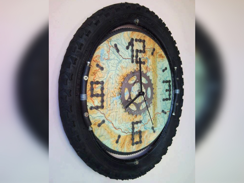 ยางรถมีลักษณะเป็นวงกลม แล้วเฟอร์นิเจอร์ที่กลมเหมือนยางจะเป็นอะไรได้อีกล่ะครับนอกจากนาฬิกา แต่การใช้ยางล้อรถมาเป็นกรอบนาฬิกา แค่นั้นมันง่ายไป ไอเดียนี้เป็นการใช้ทั้งยางนอกมาทำเป็นกรอบ สายพานมาทำเป็นขอบใน พื้นหลังของนาฬิกาใช้เป็นรูปแผนที่เก่า ๆ หน่อย ส่วนตัวเลขใช้โซ่มอเตอร์ไซค์ วงกลมตรงกลางก็ใช้ Gear มาประดับ เรียกได้ว่าใช้อุปกรณ์จากรถเก่าได้คุ้มค่าสุด ๆ แถมเท่มากเลยด้วย