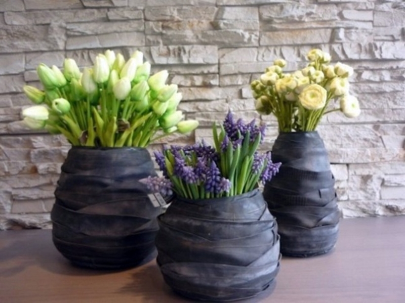 ไอเดียสุดท้ายจะแหวกแนวนิดนึงครับ เพราะที่ผ่านมาจะใช้เป็นยางนอกหมดเลย ไอเดียนี้จะเป็นการนำยางในเรียบ ๆ มาทำเป็นแจกันดอกไม้ขนาดเล็กไว้ตั้งประดับในบ้านครับ จะวางบนโต๊ะกลางโซฟาก็สวย โต๊ะกินข้าวก็ได้ หรือโต๊ะอ่านหนังสือก็ดูสดชื่นดี ไอเดียก็ง่าย ๆ ครับ นำยางในมาพันรอบแจกันใบเดิม พันแบบไม่ต้องเนี๊ยบนะครับจะได้ดูมี Texture แค่นี้เราก็ได้แจกันยางในสุดเท่แล้วครับ