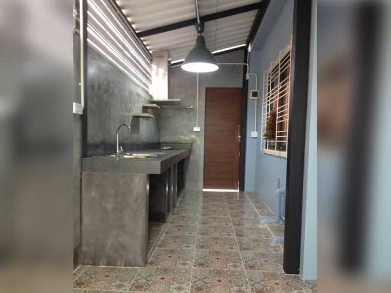 สำหรับใครที่อยู่บ้านทาวน์โฮมหรือบ้านมีพื้นที่ด้านหลังน้อยแต่ก็อยากต่อเติมครัว ผมว่าไอเดียนี้น่าสนใจเลยครับ เป็นการต่อเติมครัวแบบปูนเปลือยเรียบ ๆ ปูกระเบื้องบนพื้นเพิ่มความสวยงาม ใช้โครงเหล็กที่ติดตั้งและรื้อถอนง่าย เดินสายไฟแบบลอย ใช้เตาและซิงก์แบบ Built in ชั้นวางของ รวมถึงเครื่องดูดควันให้เรียบร้อย เท่านี้ครัวก็พร้อมสำหรับใช้ทำอาหารอร่อย ๆ ให้ครอบครัวทานแล้วล่ะครับ