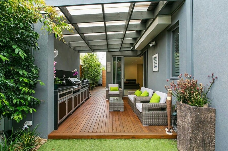 ไอเดียต่อเติมครัวหลังบ้านแบบสุดท้ายนี้จะพาคุณกลับไปสู่ความเรียบง่ายแบบที่ชีวิตควรจะเป็นครับ จะเป็นการผสมผสานระหว่างห้องครัวกับห้องนั่งเล่นแบบ Open Air ผสมรวมกันอย่างลงตัว โดยแบ่งพื้นที่ด้านซ้ายให้เป็นครัวแบบด้านเดียวยาวตลอดแนวครับ ตู้เก็บของอยู่ด้านล่าง ด้านบนปล่อยให้โล่งไป ส่วนทางด้านขวาก็วางชุดโซฟาตัวโปรดเข้าไป ส่วนพื้นใช้เป็นไม้ระแนงให้เข้ากับบรรยากาศของธรรมชาติรอบตัว ... นั่งหลับตรงนี้ยังได้เลยครับ ชิลมาก