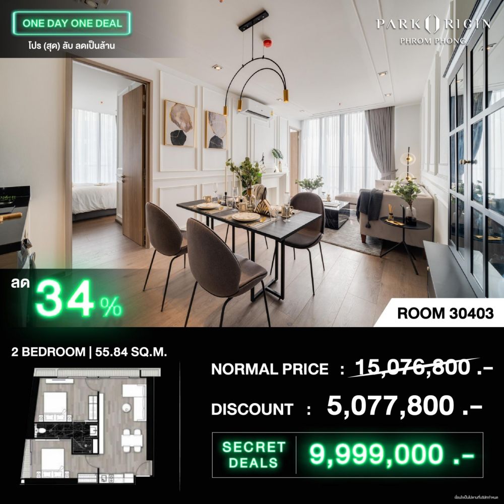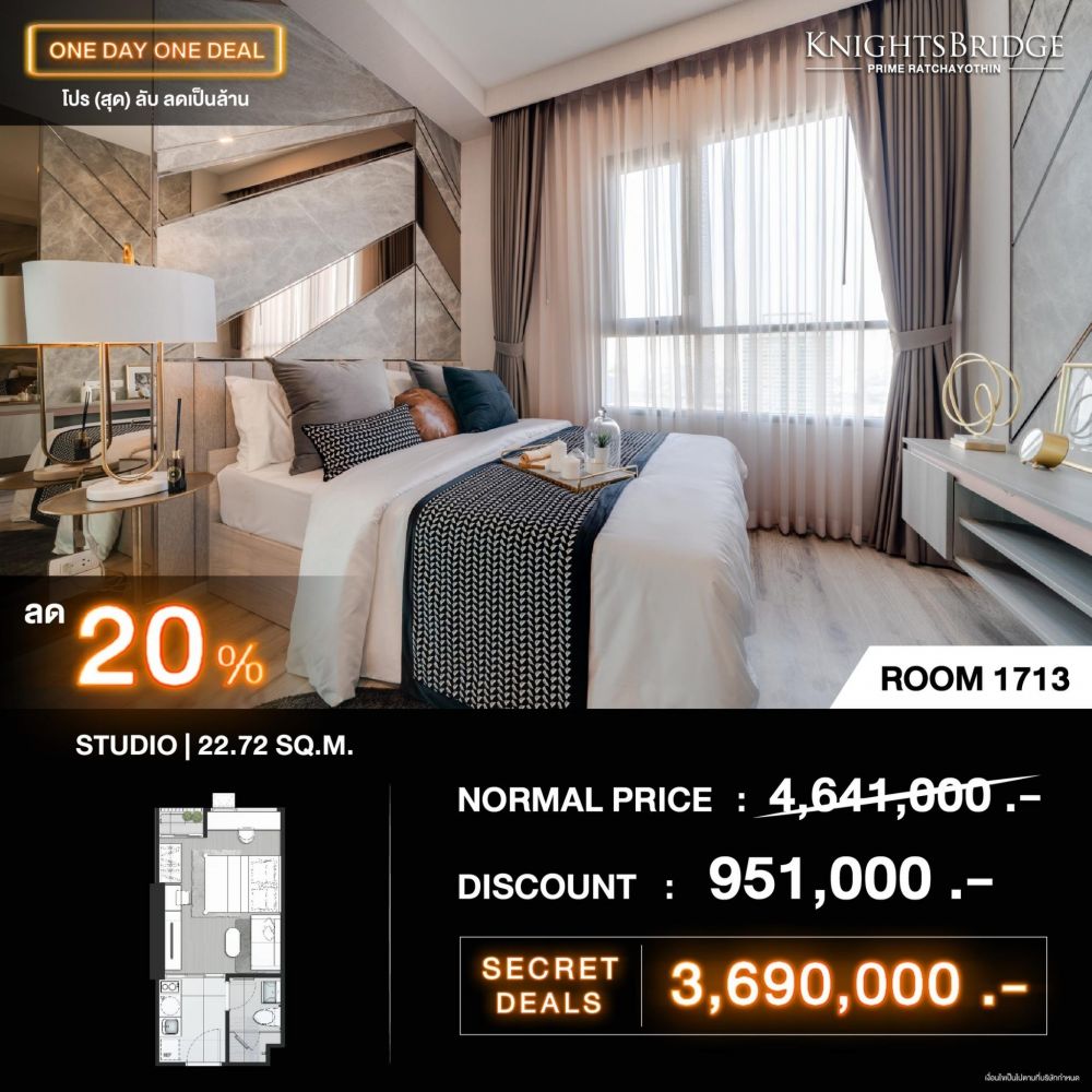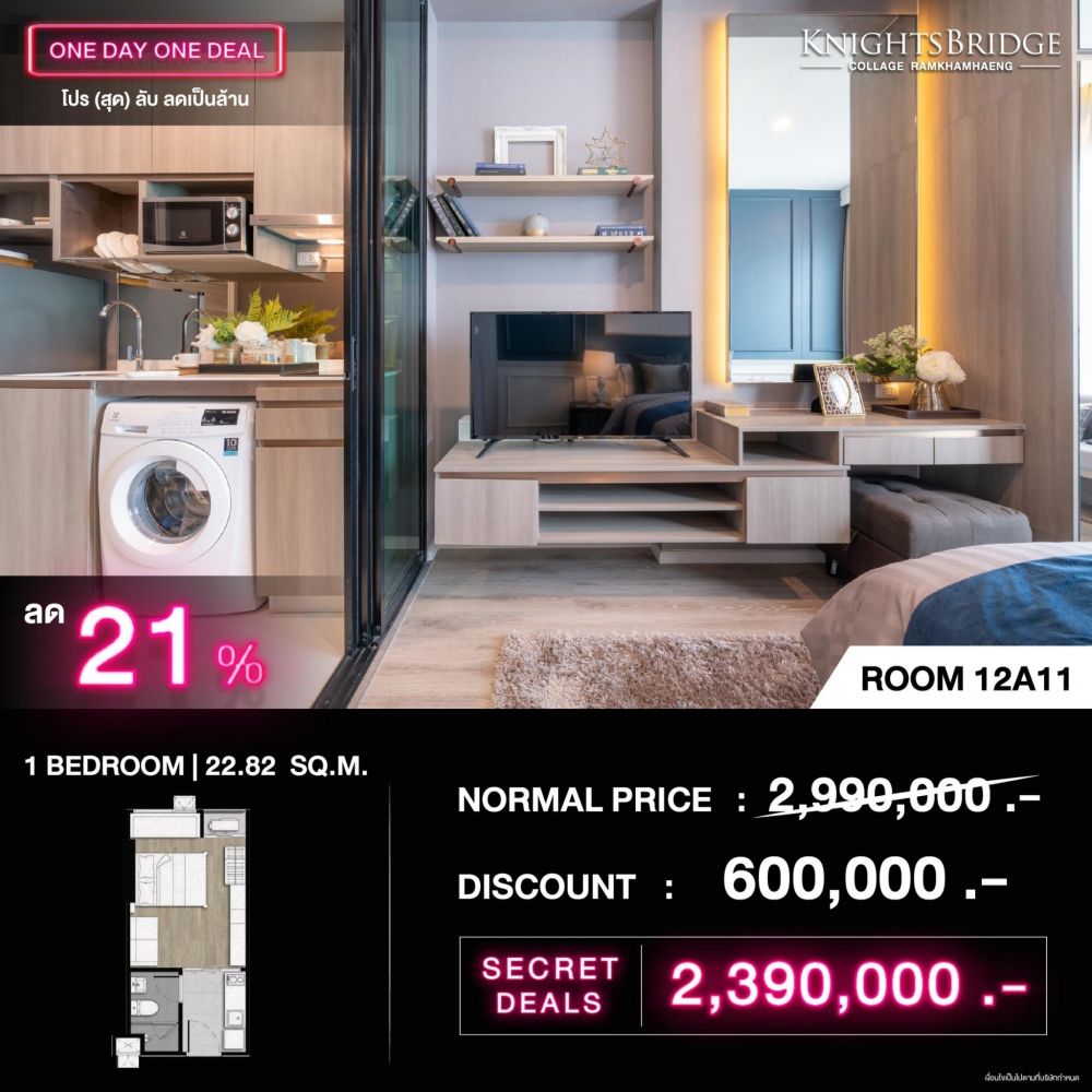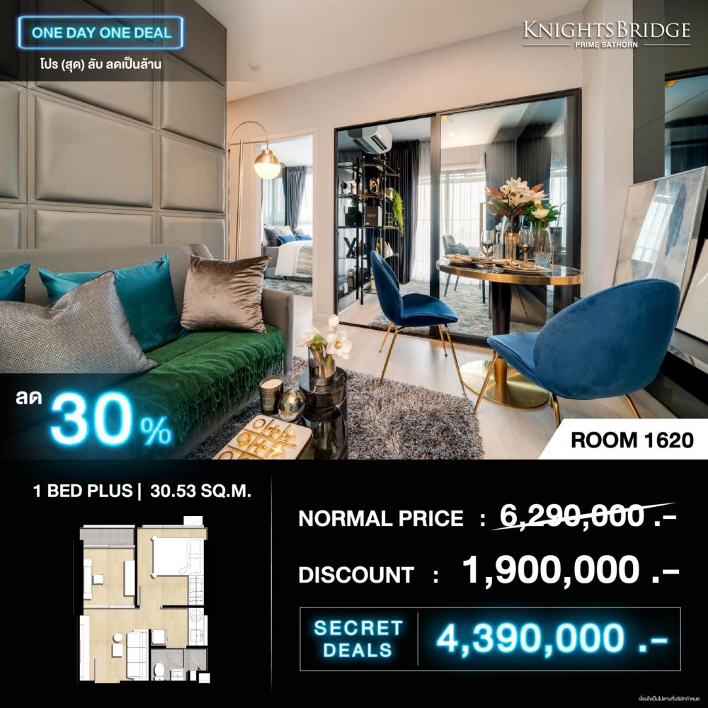 และเอ็กคลูซีฟกว่าใคร เฉพาะวันเสาร์ที่ 13 มิ.ย.นี้ กับแคมเปญ ONE DAY ONE DEAL โปร(สุด)ลับลดเป็นล้าน* คัดสรรห้องเด่น หลากสไตล์ของแต่ละโครงการ ลดสูงสุดถึง 34% ราคาเริ่มต้นเพียง 2.39 - 5.99 ล้านบาท*
