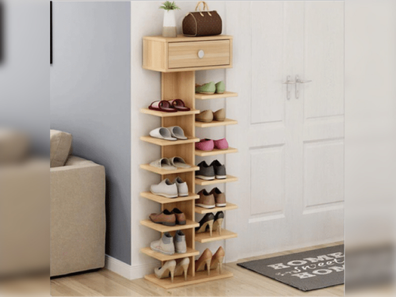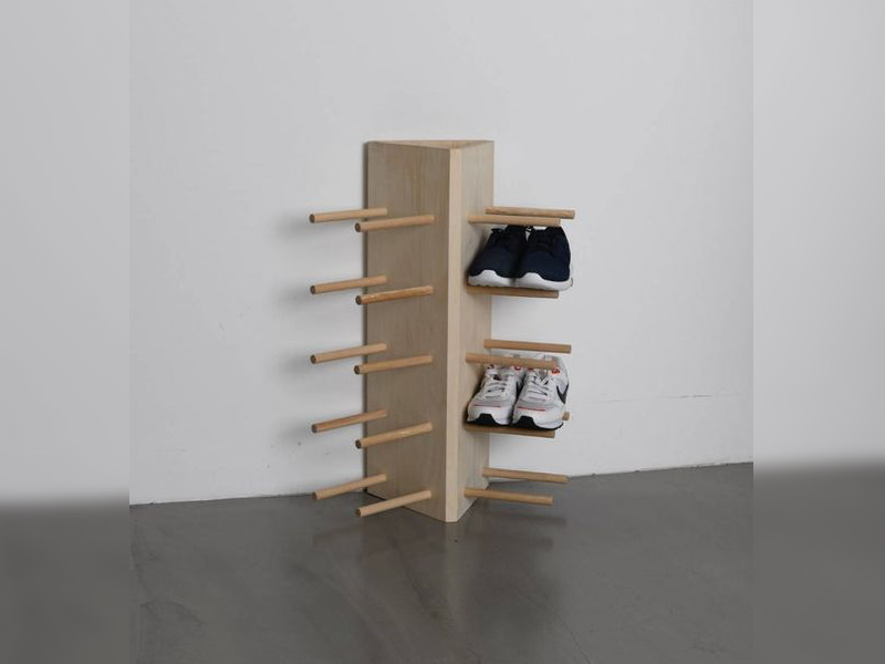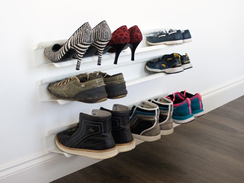 สำหรับใครที่มีรองเท้าใน Collection ยังไม่เยอะมากแบบไม่เกิน 10 คู่ ผมว่าชั้นวางแบบนี้เหมาะเลยครับ โดยตัวแท่นไม้หลักจะเป็นทรงสามเหลี่ยมแปะผนังไว้ ส่วนอีก 2 ด้านจะเป็นก้านไม้กลมจุดละ 2 แท่งเอาไว้วางรองเท้าเป็นชั้น ๆ ผมว่าเท่มากนะ มันทั้งมินิมอลและใช้พื้นที่น้อยมาก ๆ แบบนี้เอาไปแทรกไว้ตรงไหนก็ได้เลย