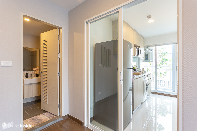 ห้องครัวและห้องน้ำ อยู่ในพื้นที่เดียวกัน รูปแบบการจัดวางและฟังก์ชันการใช้งานเหมือนกับห้องแรกเลย หมายความว่าเข้าห้องครัวมาห้องน้ำจะอยู่ซ้ายมือและห้องครัวกับระเบียงอยู่ทางขวา