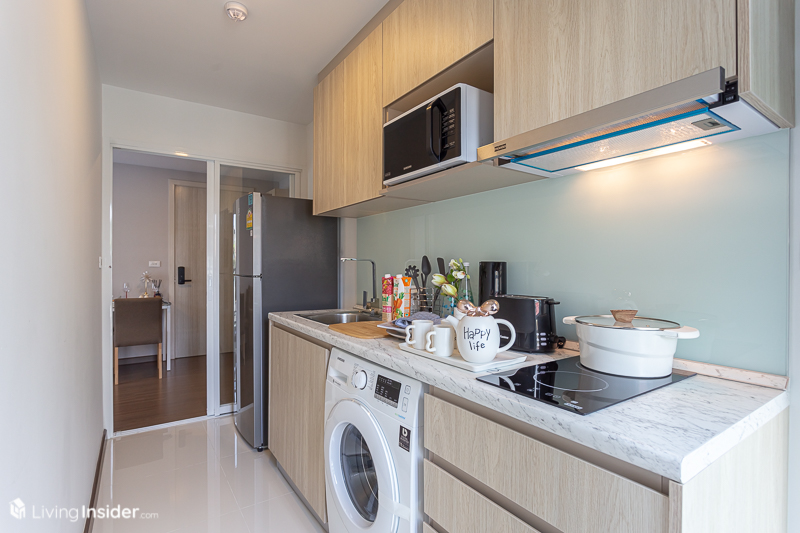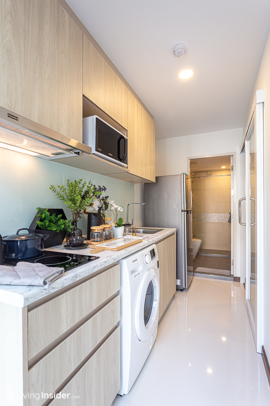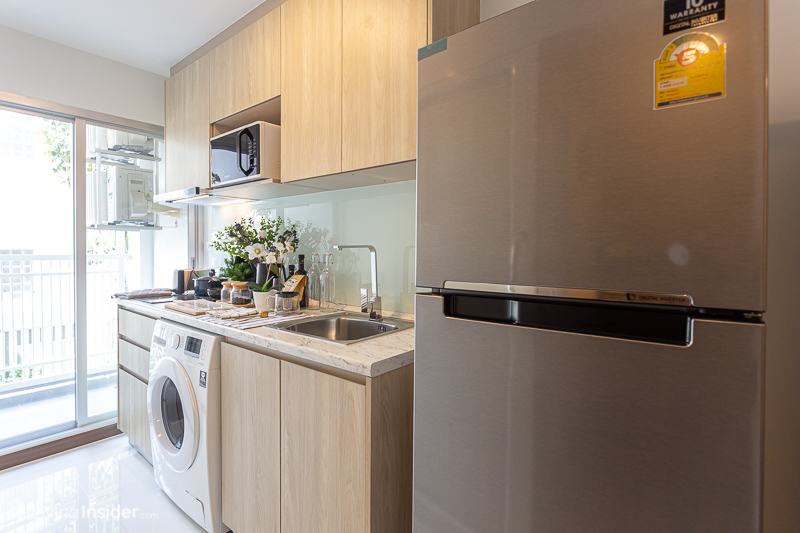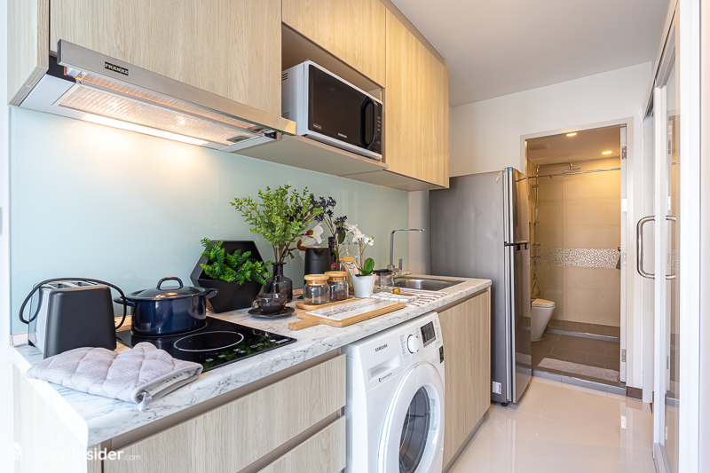 ห้องครัว เป็นแบบครัวปิดให้ทำอาหารจริงจังได้อย่างจัดเต็ม เคาน์เตอร์ครัวด้านล่างมีลิ้นชักเก็บของพร้อมกับพื้นที่วางเครื่องซักผ้า ตัว Top เป็น HPL ลายหินอ่อนสีขาว