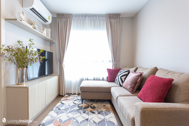 ฝั่งตรงข้ามบิวท์อินชั้นวางทีวีที่สามารถเก็บของเพิ่มเติมได้ ส่วนด้านบนทำเป็นชั้นวางของได้นิดหน่อย ซึ่งห้องนั่งเล่นจะอยู่ติดกับริมหน้าต่างช่วยให้แสงธรรมชาติเข้าห้องได้มากทำให้ห้องดูกว้างกว่าเดิม