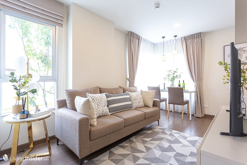 วกกลับเข้ามาที่ทางเข้าห้องจะเป็นส่วนของ ห้องนั่งเล่น ที่นอกจากวางโต๊ะกินข้าวแล้ว ยังมีพื้นที่เหลือเฟือให้วางโซฟารูปตัวแอล ขนาด 3 ที่นั่งได้อีกต่างหาก