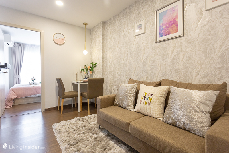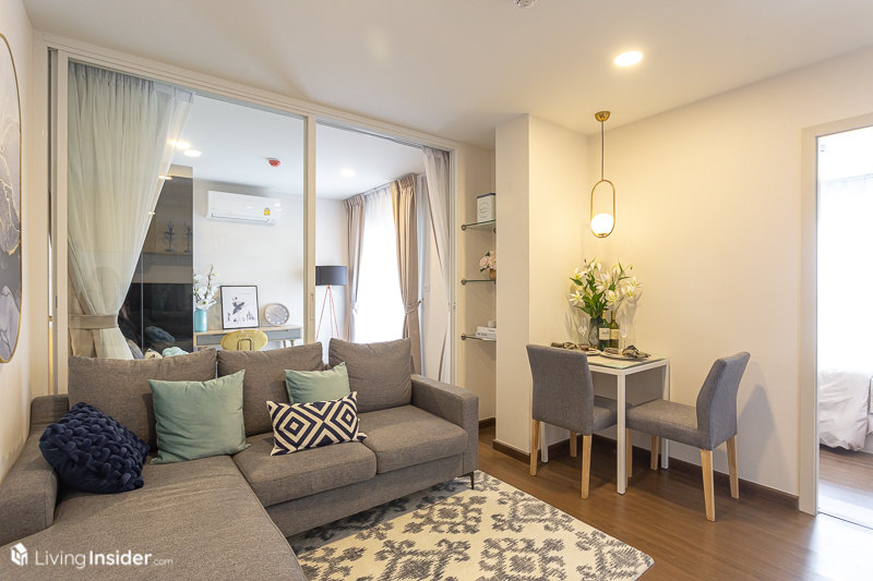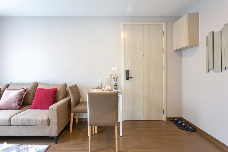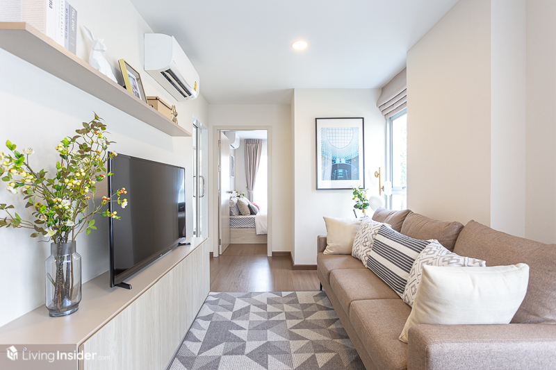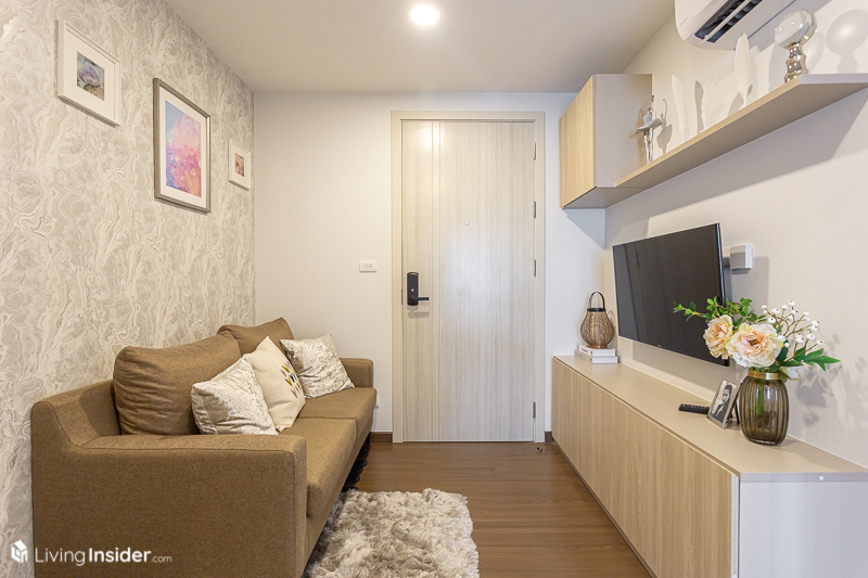 ห้องแรก 1 BEDROOM ขนาด 26-28 ตารางเมตร Type นี้เปิดมาจะเจอกับ ห้องนั่งเล่น ก่อนเลย โดยให้โซฟาขนาด 2 ที่นั่งตามที่เห็น พร้อมบิวท์ชั้นวางทีวี และตู้เก็บของด้านบนหน้าตาแบบนี้มาให้พร้อมใช้งาน ด้านข้างวางโต๊ะกินข้าวขนาด 2 ที่นั่ง ซึ่งทางโครงการก็ให้มาด้วยอีกเช่นเดิม