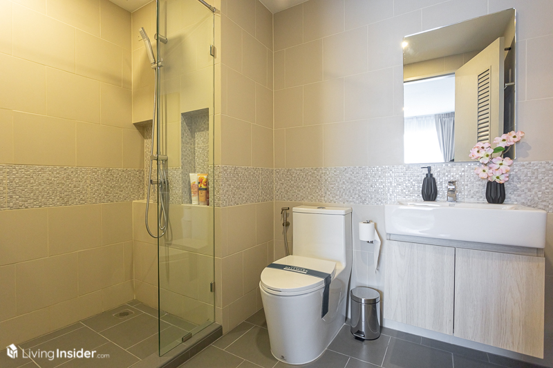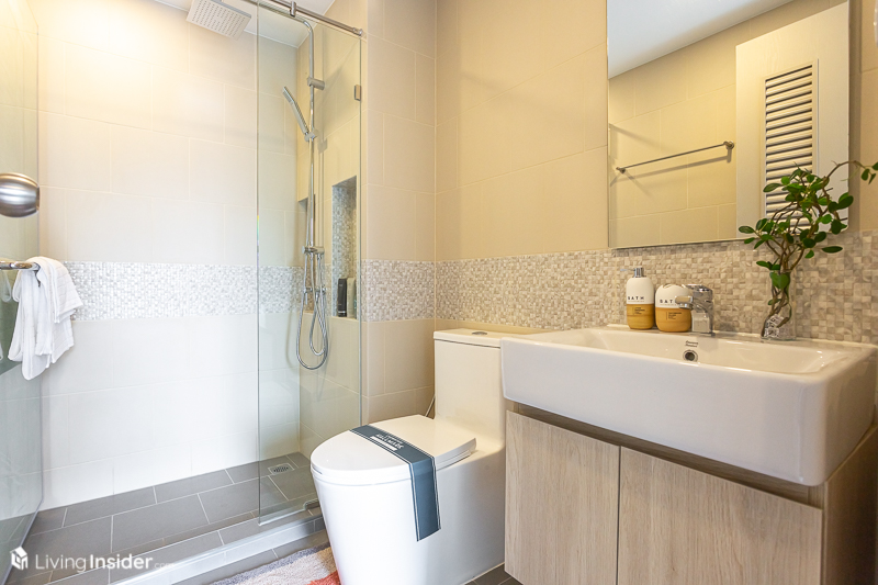 ถัดไปเป็นส่วนของ ห้องน้ำ อยู่พื้นที่รวมกับห้องครัวได้สุขภัณฑ์ครบ ทั้งอ่างล้างหน้าของ American Standard ที่มีตู้เก็บของด้านล่างด้วย โถสุขภัณฑ์ของ Cristina และได้ Rain Shower ซึ่งหาได้ยากมากในคอนโด Low Rise หรือคอนโดที่ต่ำกว่า 100,000 บาท/ตารางเมตร นอกจากนี้ยังได้กระจกนิรภัยเพื่อกั้นส่วนเปียกส่วนแห้ง