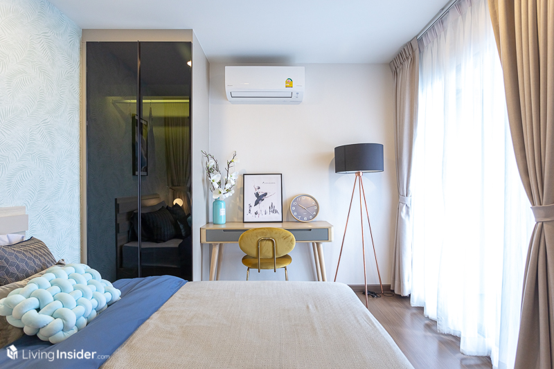 และอย่างที่บอกว่า 1 ห้องนอนจริงๆ ก็เพราะว่าโครงการทำเป็นผนังและประตูทึบมาให้ ได้เตียง 6 ฟุต พร้อมกระจกเต็มบานซึ่งจะได้หน้าต่างแบบบานสไลด์ ทำให้ลมจากข้างนอกเข้ามาได้อย่างเต็มที่ ช่วยให้ห้องไม่อับชื้นดูโปร่งสบาย