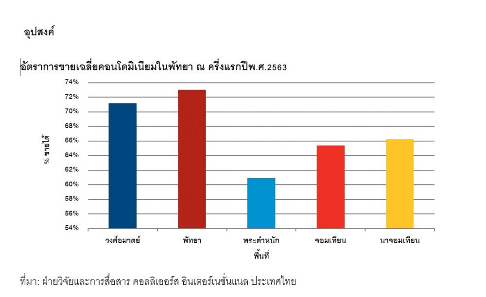 ณ ครึ่งแรกปี พ.ศ.2563 แม้ว่าอัตราการขายเฉลี่ยในตลาดคอนโดมิเนียมพัทยาจะอยู่ที่ประมาณ 66% ซึ่งปรับเพิ่มขึ้นเล็กน้อยจากในช่วงครึ่งหลังของปีที่ผ่านมา แต่พบว่ายังคงมีคอนโดมิเนียมเหลือขายอยู่ในตลาดอีกมากกว่า 20,000 ยูนิต ในทุกพื้นที่ของตลาดคอนโดมิเนียมเมืองพัทยา เนื่องจากพบว่าในปี พ.ศ. 2562 ที่ผ่านมา ที่อุปทานเปิดขายใหม่ในพัทยาหลายโครงการเป็นโครงการขนาดใหญ่