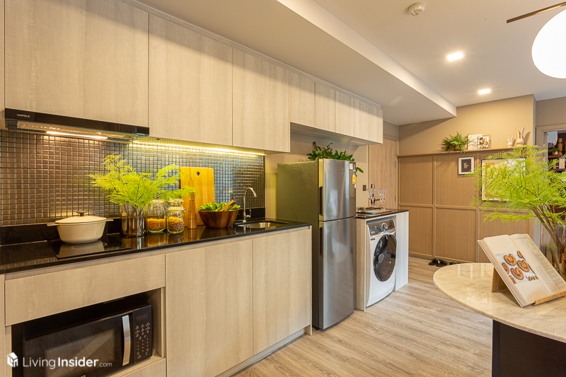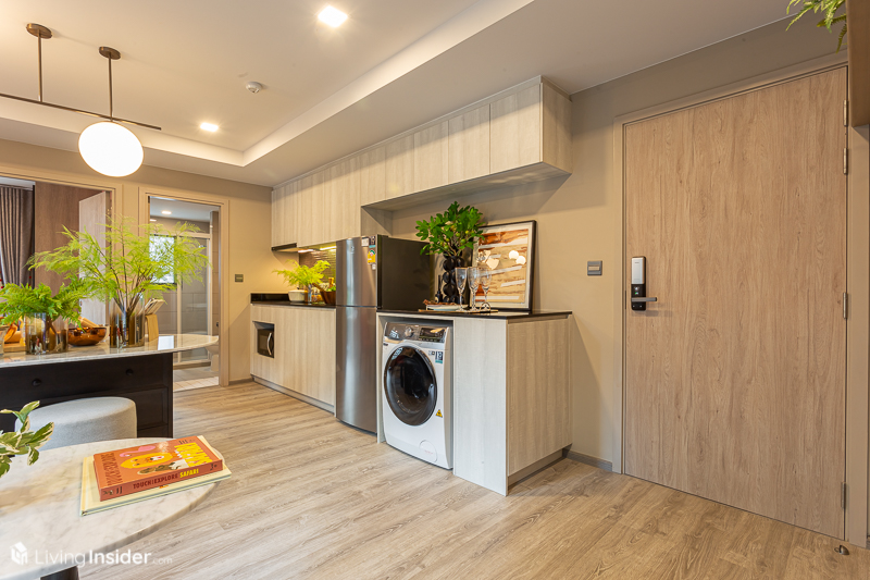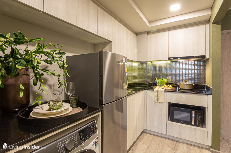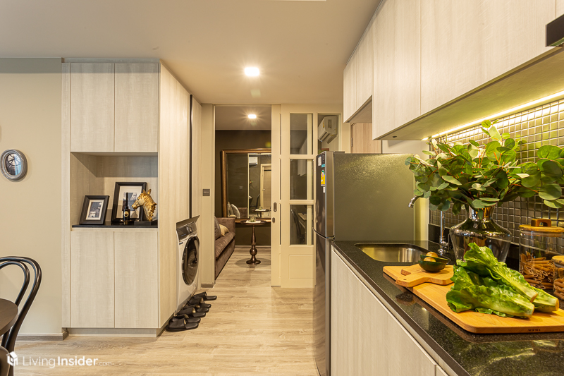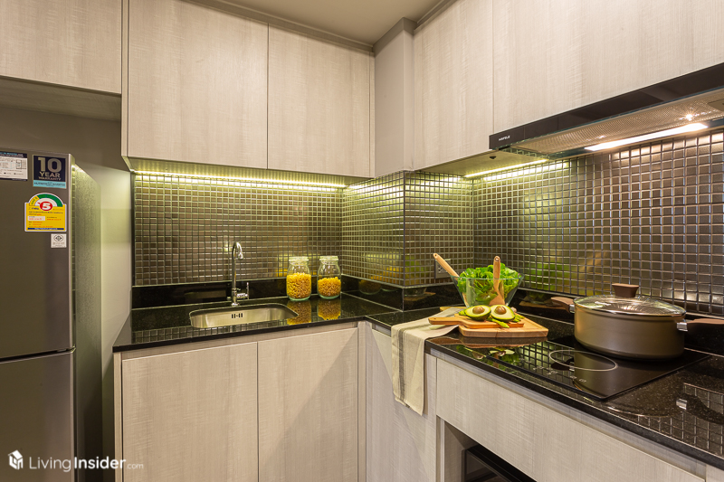 มาถึงจุดที่ส่วนตัวคิดว่าเป็นไฮไลท์ของห้องนี้ ที่เป็นส่วนของห้องครัวแบบเปิดแต่ก็ยังแบ่งเป็นสัดส่วนด้วยผนังที่กั้นระหว่างห้องนั่งเล่นกับห้องครัว สำหรับเคาน์เตอร์ครัวและเตาไฟฟ้าพร้อมเครื่องดูดควันจะได้เหมือนกับห้องแรก ไม่แตกต่างกันมากนัก