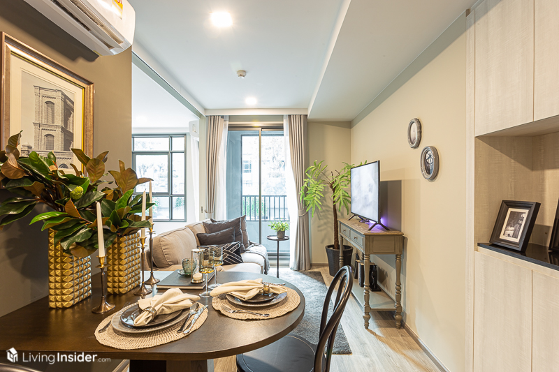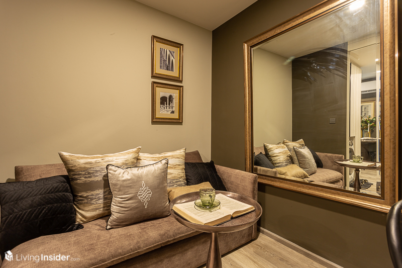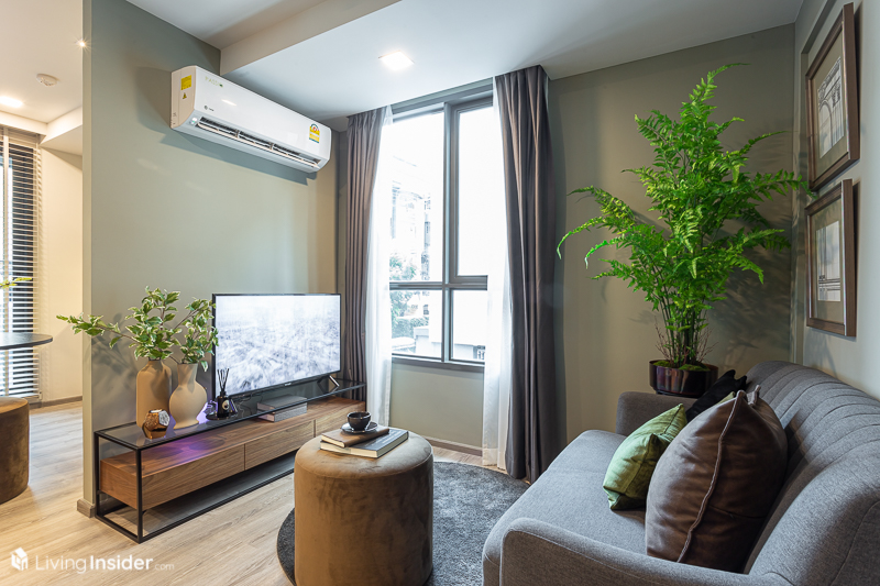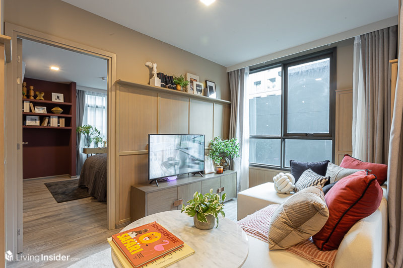 ด้านในสุดของห้องเป็น ห้องนั่งเล่น วางโซฟาขนาด 2 ที่นั่ง ฝั่งตรงข้ามเป็นชั้นวางทีวี ที่พอวางแล้ว ก็ยังมีระยะให้เดินไปสู่ระเบียงด้านนอกได้แบบไม่ต้องกลัวชนข้าวของต่างๆ