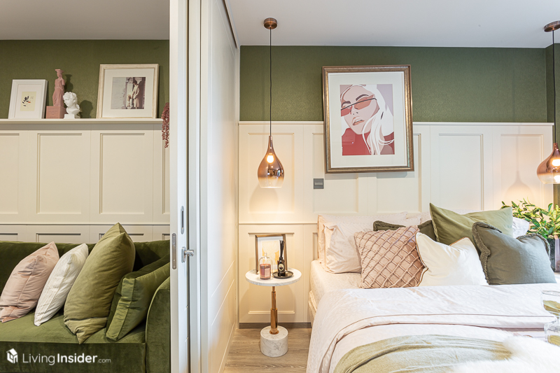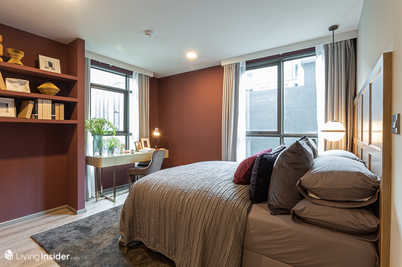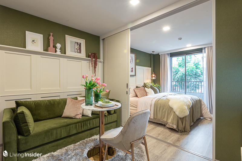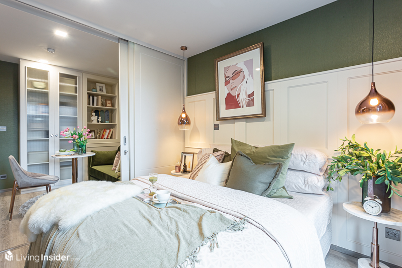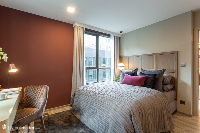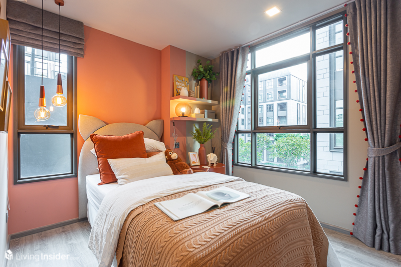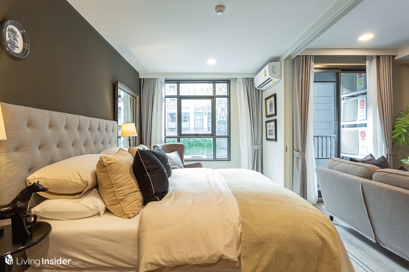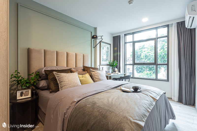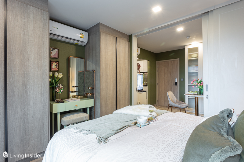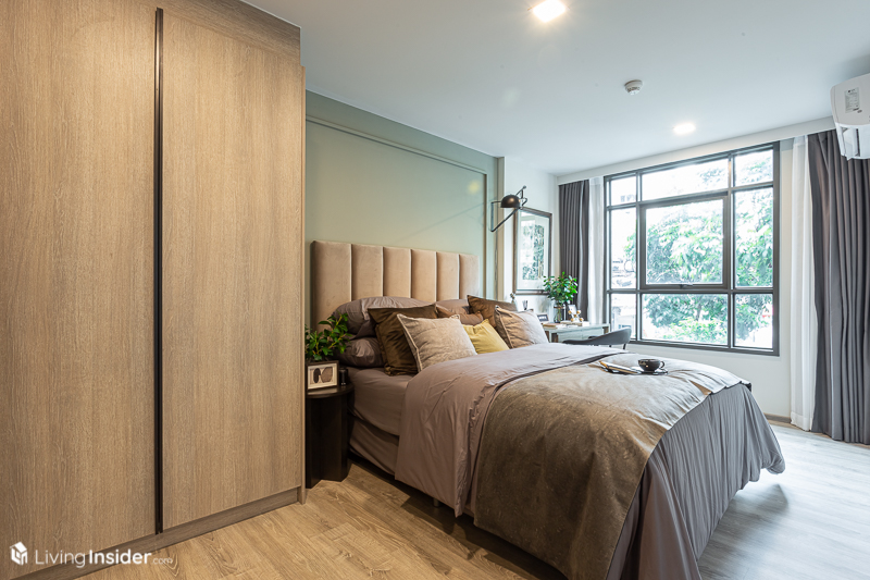 ห้องนอน จะถูกกั้นด้วยประตูบานเลื่อนแบบทึบมาให้ เพื่อให้เกิดความไพรเวซี่ของผู้อยู่อาศัย โดยวางเตียง 5 ฟุต จะทำให้มีพื้นที่สำหรับวางโต๊ะเครื่องแป้งได้ โดยหน้าต่างเป็นบานกระทุ้งล้อมรอบด้วยกระจกใส ส่งผลให้แสงธรรมชาติเข้ามาได้มากห้องจึงดูโปร่งโล่ง