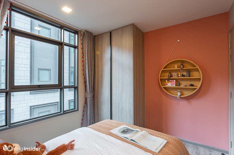 เข้าสู่ ห้องนอน ได้ประตูทึบเพื่อความเป็นส่วนตัว วางเตียง 5 ฟุต ก็ยังมีพื้นที่เหลือ ให้เดินไปทางริมหน้าต่าง ซึ่งมีสเปซพอให้วางโต๊ะทำงานหรือโต๊ะเครื่องแป้ง อีกฝั่งที่ติดกับประตูห้องน้ำโครงการบิวท์ตู้เสื้อผ้าขนาดใหญ่สูงสุดเพดานมาให้ด้วย เก็บเสื้อผ้าได้เยอะทีเดียว