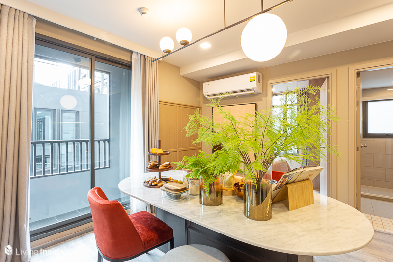 แต่ถ้ายังไม่พอด้านข้างมีพื้นที่ให้วางโต๊ะกินข้าวได้ถึงขนาด 4 ที่นั่ง เลือกโต๊ะใหญ่ได้เลย วันไหนต้องทำขนมให้เด็กๆ กิน และต้องใช้พื้นที่ค่อนข้างเยอะ ก็สามารถใช้โต๊ะซึ่งอยู่ในพื้นที่เดียวกันกับส่วนครัวได้อย่างสะดวก อีกทั้งระเบียงจะอยู่ตรงโซนนี้ เพื่อให้แสงธรรมชาติส่องเข้ามาได้อย่างทั่วถึงทุกพื้นที่
