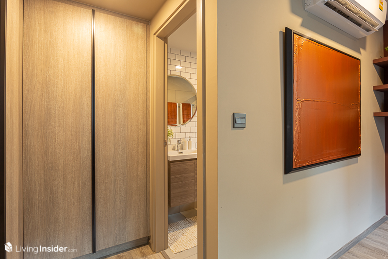 ตรงข้ามเป็นตู้เสื้อผ้าที่โครงการบิวท์มาให้ทั้งสองตู้ซ้ายขวา เพื่อให้เก็บเสื้อผ้าได้เต็มที่แบบไม่ต้องกังวลว่าผ้าจะยับ