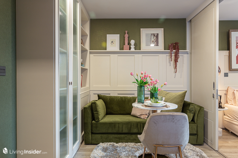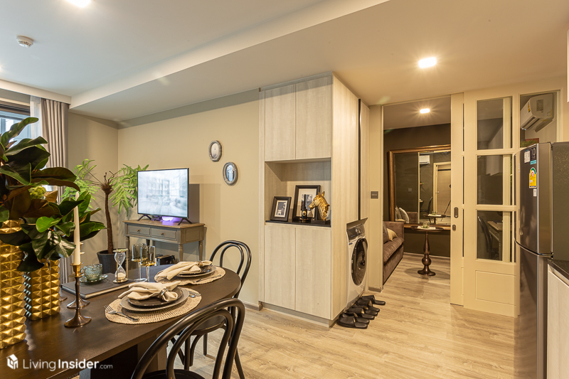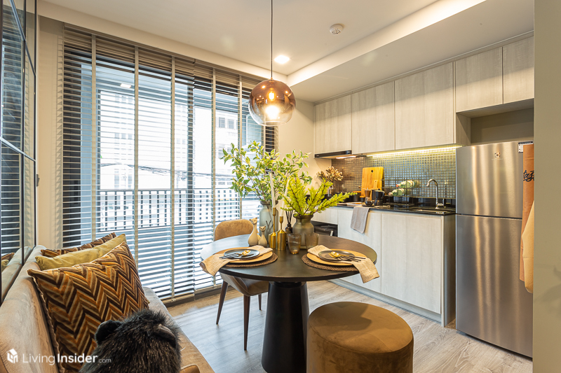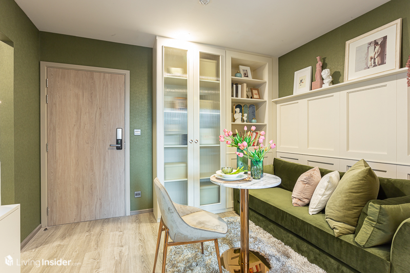 และถ้าใครมีของเยอะแนะนำให้บิวท์ตู้เก็บของสุดเพดานตามห้องตัวอย่างได้เลย หรือใครจะปรับเปลี่ยนเป็นวางโต๊ะกินข้าวขนาด 2 ที่นั่ง หรือโต๊ะทำงานเข้ามุมก็ได้ทั้งนั้น