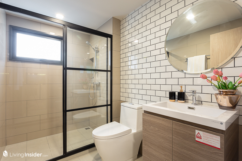 ติดกันเป็น ห้องน้ำ ขนาดไม่เล็กนะขอบอก ซึ่งนอกจากได้สุขภัณฑ์ครบทั้ง อ่างล้างหน้า โถสุขภัณฑ์ และโซนอาบน้ำแล้ว ยังชอบการตกแต่งที่ทำให้แตกต่างจากที่อื่น ดูเท่และมีความทันสมัย ไล่ตั้งแต่กระเบื้องผนังลายอิฐสีขาว ไปจนถึงฉากกั้นแบบบานเลื่อน 3 ตอนสีดำ ทำมาให้อย่างดี ของจริงก็ได้แบบนี้ด้วยนะ