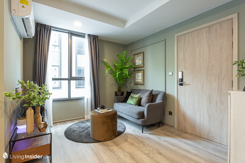 เข้าห้องมาแล้วพบกับ ห้องนั่งเล่น วางโซฟาขนาด 2 ที่นั่ง ได้ทั้งแบบตัวไอและตัวแอล มีช่องแสงเปิดหน้าต่างให้ห้องดูโปร่งและอากาศถ่ายเทสะดวก