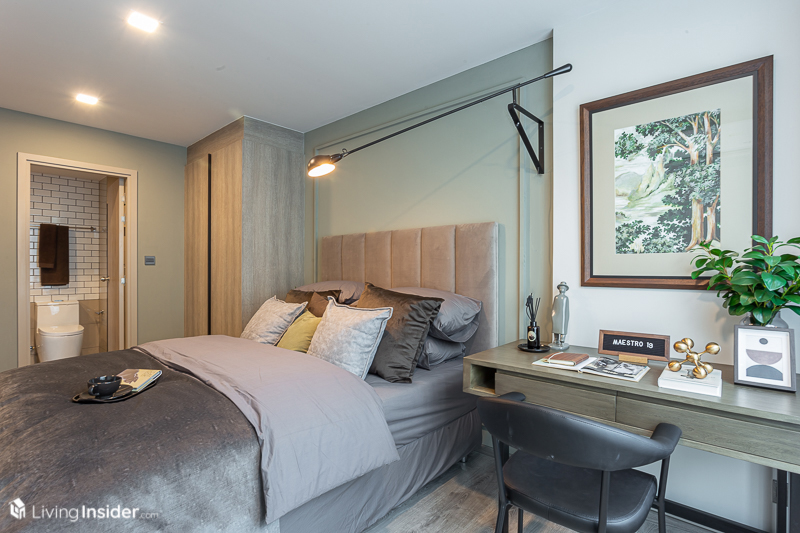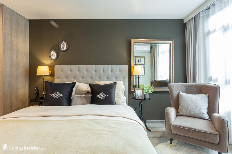 ติดกับห้องนั่งเล่นคือ Master Bedroom วางเตียง 5 ฟุต ส่วนฝั่งตรงข้ามมีระยะให้วางได้ทั้งโต๊ะเครื่องแป้งสำหรับภรรยา และโต๊ะทำงานของสามี ได้มีมุมส่วนตัวแยกกันไปเลย