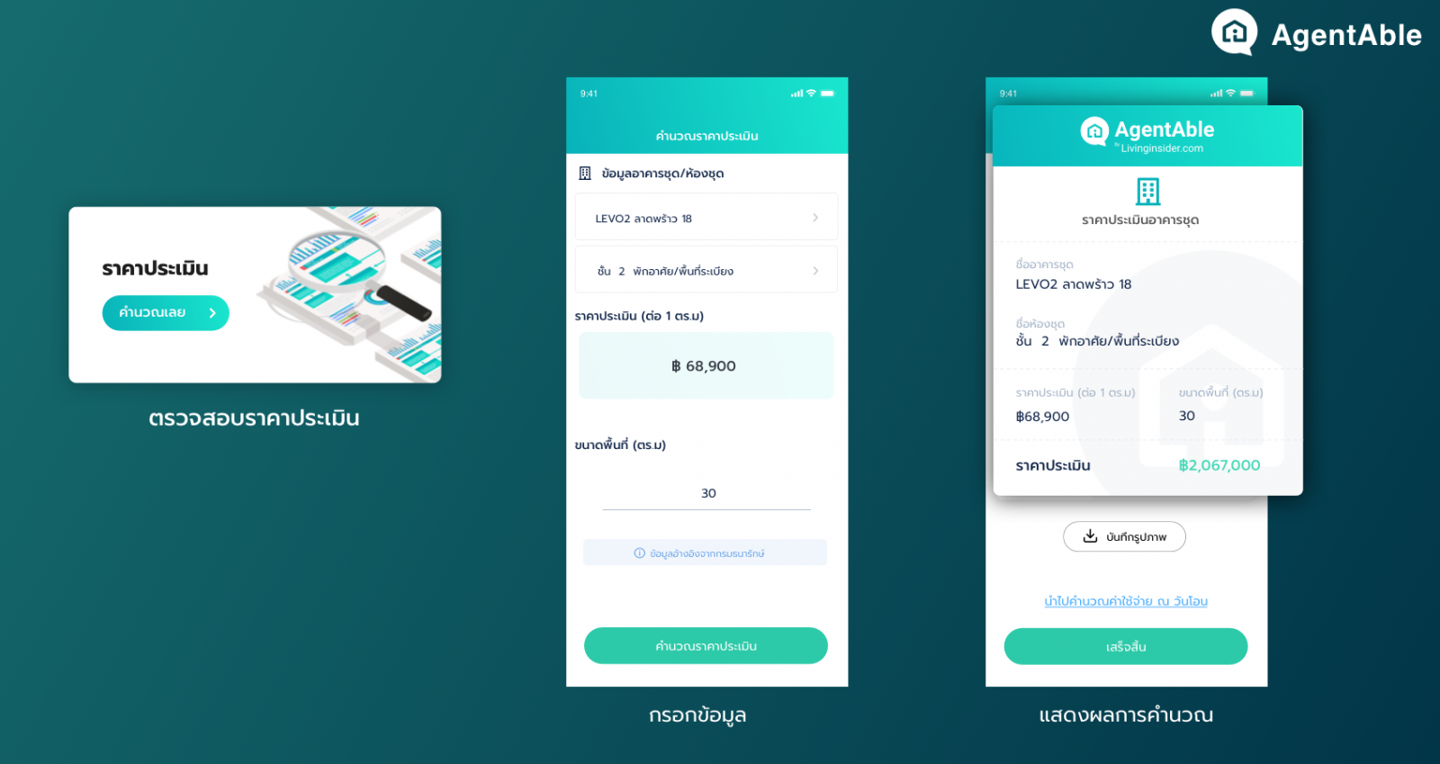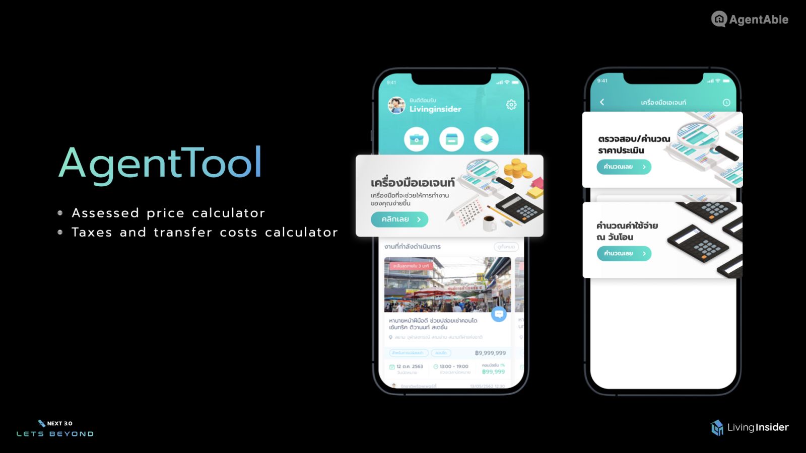 โดยวิธีประเมินราคาค่าใช้จ่ายเหล่านี้ที่เอ่ยมาข้างต้น เราไม่จำเป็นต้องคิดเองให้ยุ่งยากวุ่นวายและอาจเกิดข้อผิดพลาดอีกด้วย ทาง Livinginsider จึงคิดค้นโปรแกรม “Agent Tools” ที่คำนวณออกมาให้เสร็จสรรพ ได้อย่างแม่นยำและถูกต้อง เพียงดาวน์โหลดแอปพลิเคชัน ในชื่อว่า “AgentAble” สามารถใช้ได้ทั้ง ios และ Android เมื่อลงทะเบียนเรียบร้อย หลังจากนั้นให้เข้า “Agent Tools” ซึ่งจะอยู่หน้าแรกของแอปพอดี