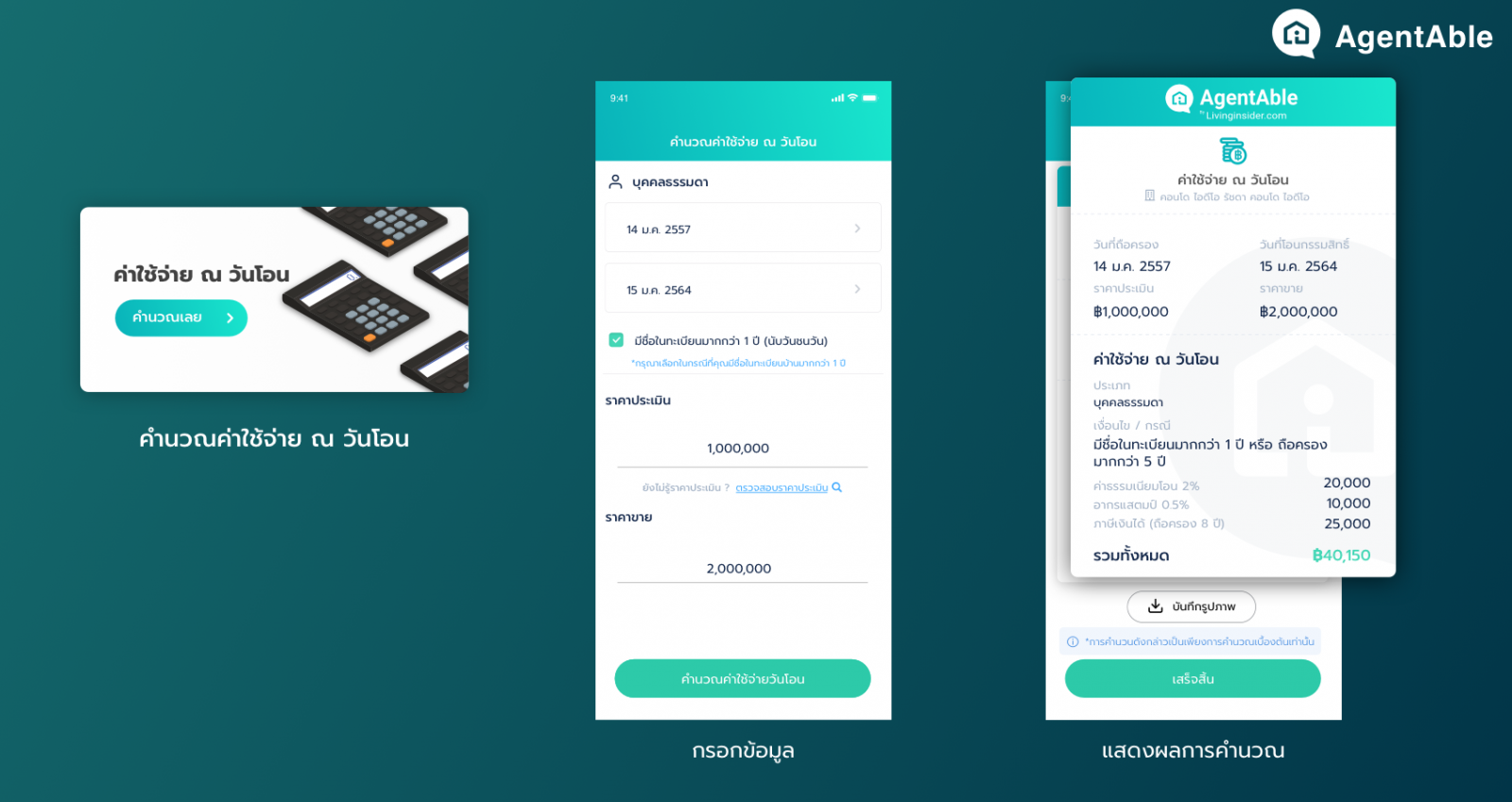 ใครสนใจอยากรู้ว่า ต้องเตรียมเงินก้อนไว้เท่าไหร่ถึงจะเพียงพอ แนะนำให้ลองโหลดแอปพลิเคชัน “AgentAble” รับรองว่าใช้เวลาคำนวณไม่ถึง 5 นาที ก็เป็นอันเสร็จเรียบร้อย อีกหนึ่งในวิธีคำนวณค่าธรรมเนียมการโอน ที่ง่าย สะดวก และรวดเร็ว ตอบรับยุค Digital Disruption