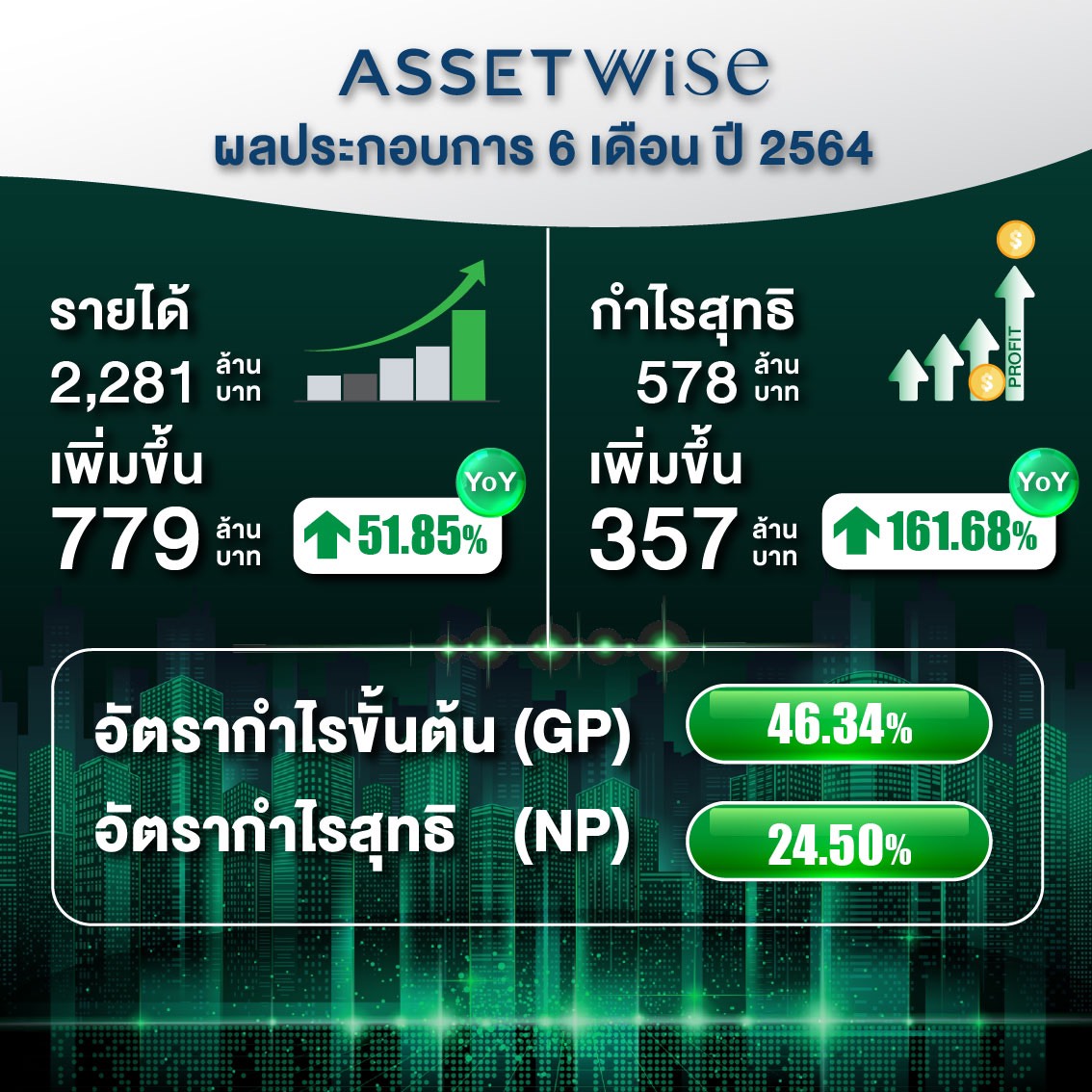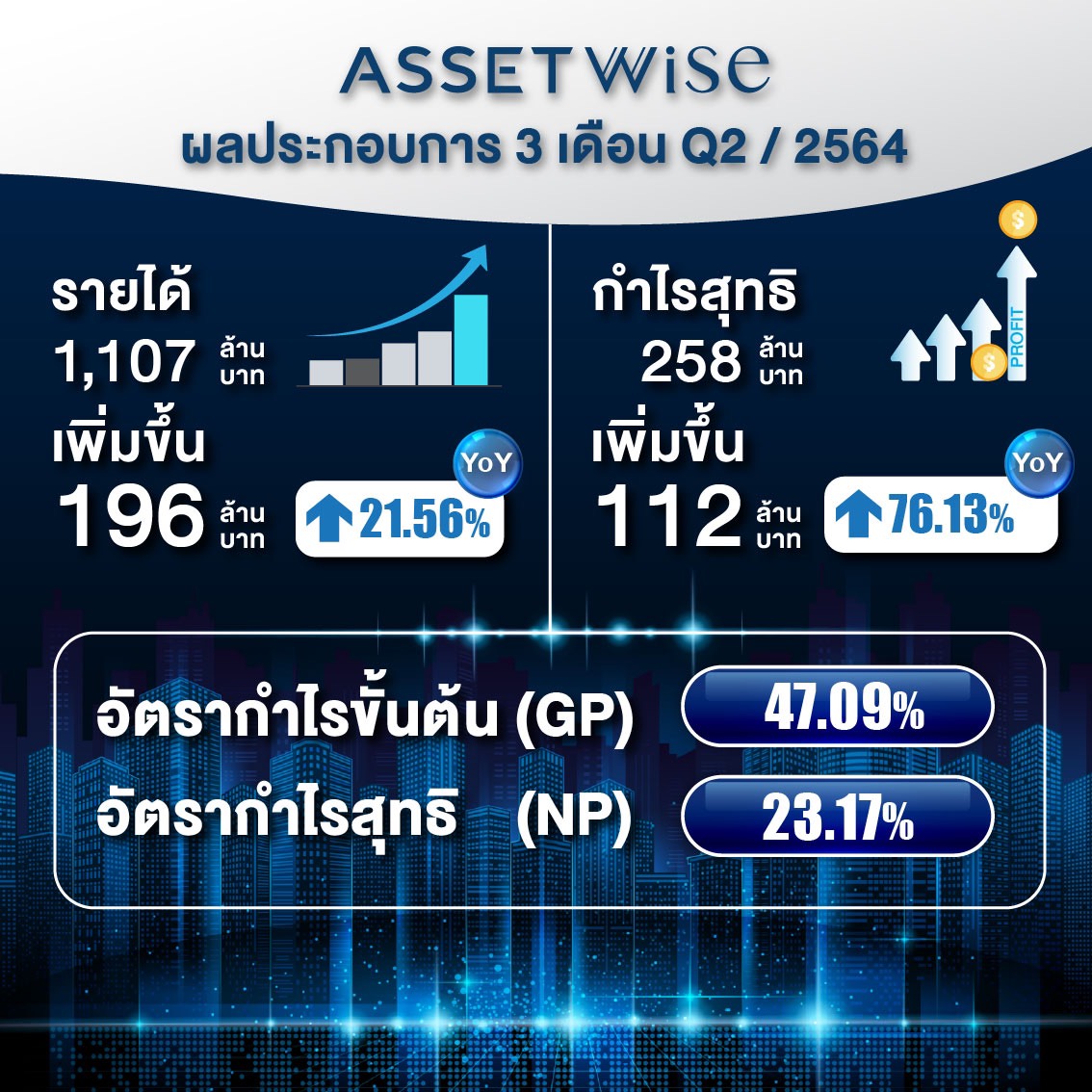 บมจ.แอสเซทไวส์ (ASW) โชว์ศักยภาพสุดแกร่งฝ่าโควิด เปิดงบไตรมาส 2/64 กำไรสุทธิแตะ 258.0 ล้านบาท เพิ่มขึ้น 76.1 % และมีรายได้รวม 1,107.2 ล้านบาท เพิ่มขึ้น 21.6% ผลจากรับรู้ยอดโอนกรรมสิทธ์ โครงการในแบรนด์ Kave ,Atmoz และ Modiz คึกคัก บอร์ดเคาะจ่ายเงินปันผลระหว่างกาลเป็นหุ้นในอัตรา 8 หุ้นเดิมต่อ 1 หุ้นปันผล