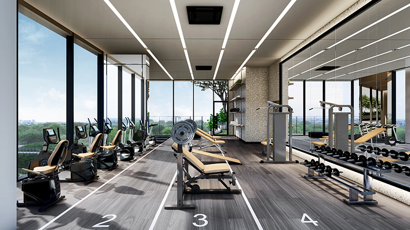 Fitness ผนังห้องถูกเปลี่ยนเป็นกระจกรอบทิศทาง ทำให้มองทิวทัศน์ของธรรมชาติแบบสบายตา พร้อมอุปกรณ์ออกกำลังกายครบครัน เพื่อเสริมสร้างสุขภาพที่แข็งแรง