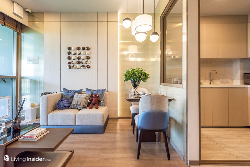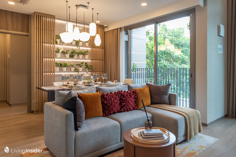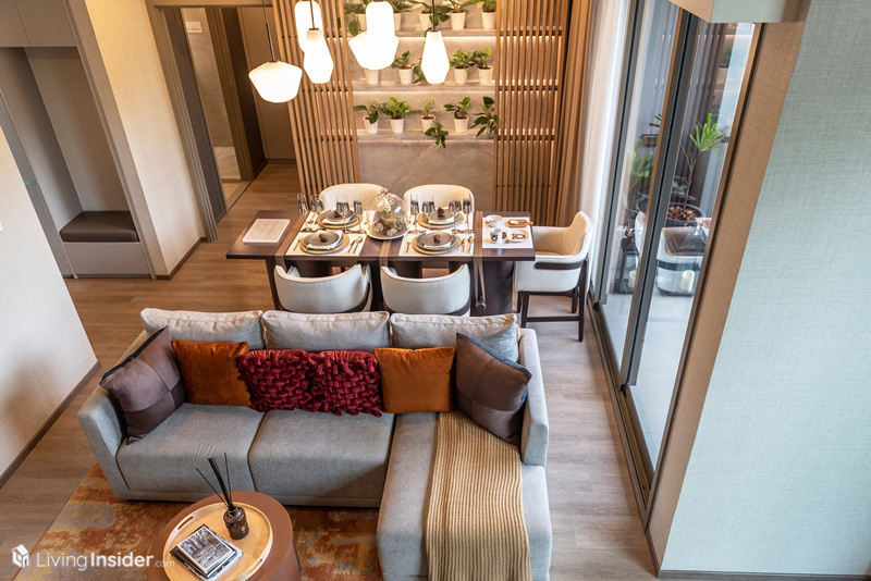 ฝั่งตรงข้ามวางโซฟาได้ขนาด 2 ที่นั่ง และโต๊ะกลาง 1 ตัว ติดกันเป็นส่วนของโต๊ะนั่งรับประทานอาหารขนาด 2 ที่นั่งเช่นเดียวกัน ซึ่งก็ยังมีสเปซเหลือให้เดินได้แบบสะดวกสบาย โดยบริเวณนี้ตำแหน่งปลั๊กไฟจะอยู่สูงกว่าปกติ ประมาณ 1 เมตร เพื่อป้องกันน้องหมาน้องแมว เวลาเล่นซนจะได้ไม่เกิดอันตราย
