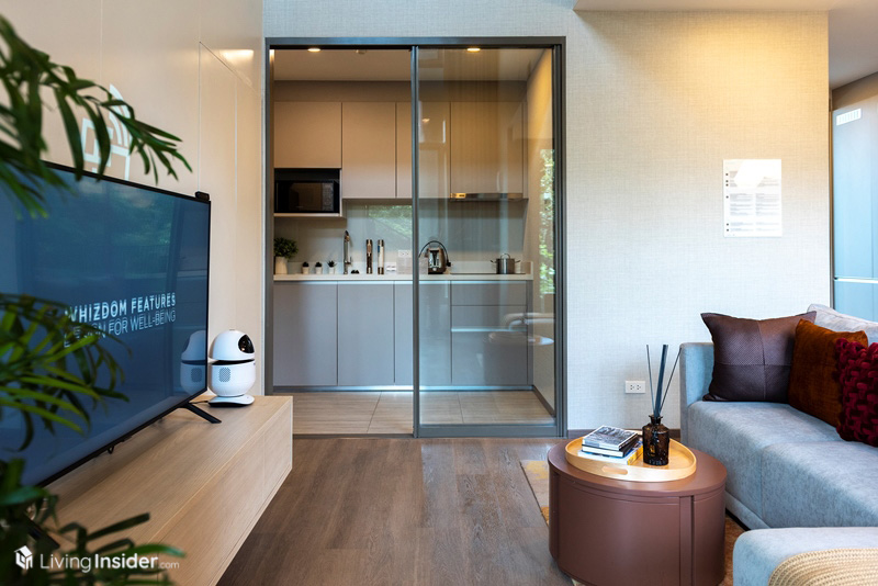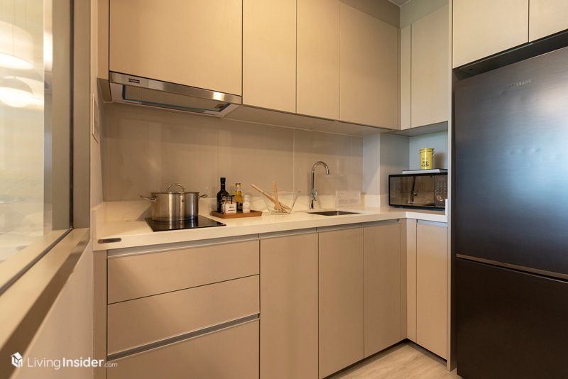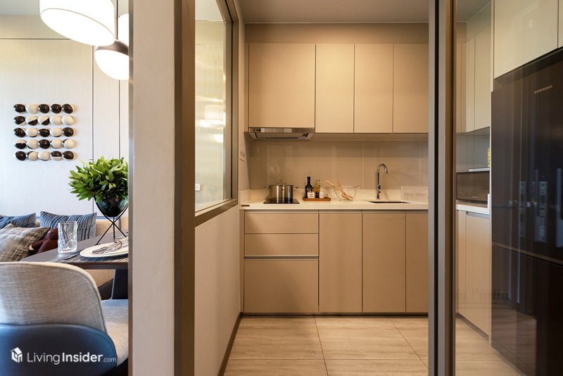 ขวามือจะเจอกับ ห้องครัวแบบปิด กั้นด้วยประตูกระจกใส ขนาดกว้างขวาง ผนังฝั่งหนึ่งกรุด้วยกระจกช่วยดึงแสงให้เข้าห้องครัวเพื่อความโปร่ง โดยได้เคาน์เตอร์ครัวเป็นรูปตัวแอล ทำจากวัสดุ Food Grade ตัวท็อปเป็นหินควอทซ์ มีความทนทานแข็งแรง ด้านหลังเคาน์เตอร์ (backsplash) กรุกระจกช่วยให้เช็ดคราบสกปรกออกได้ง่าย รวมถึงได้เตาไฟฟ้า 2 หัว และเครื่องดูดควัน จากแบรนด์ Franke พร้อมช่องเก็บของด้านบนที่บิวท์มาให้สุดเพดาน