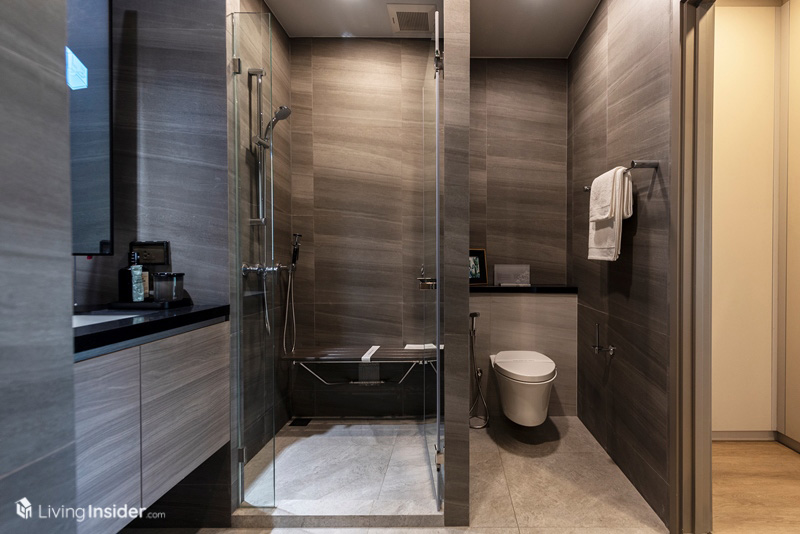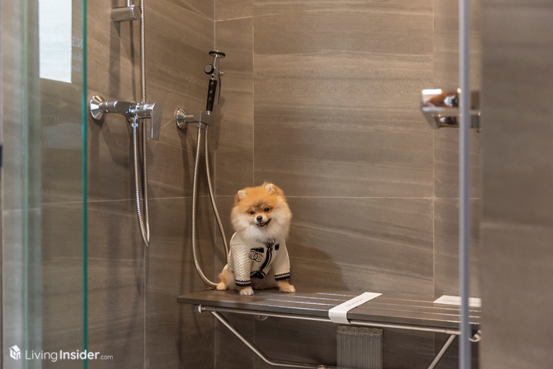 ออกมาจากห้องครัวจะเจอกับ ห้องน้ำขนาดใหญ่ ซึ่งเข้าออกได้สองทางคือฝั่งทางเดินและในห้องนอน พร้อมติดฉากกั้นอาบน้ำมาให้เรียบร้อย โดยมีจุดเด่นตรงออกแบบที่นั่งอาบน้ำสัตว์เลี้ยงไว้ให้ เท่านั้นไม่พอยังให้ฝักบัวสำหรับน้อง ที่สามารถเปิดปิดน้ำได้ด้วยมือเดียวแยกต่างหากอีกด้วย