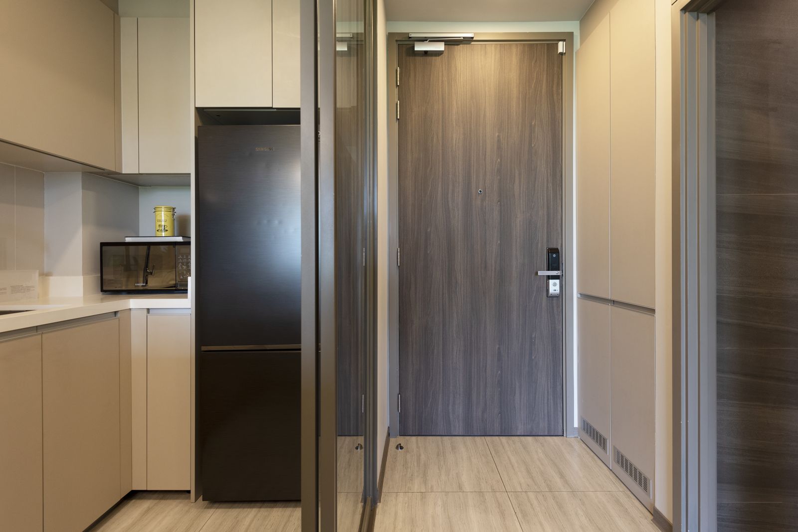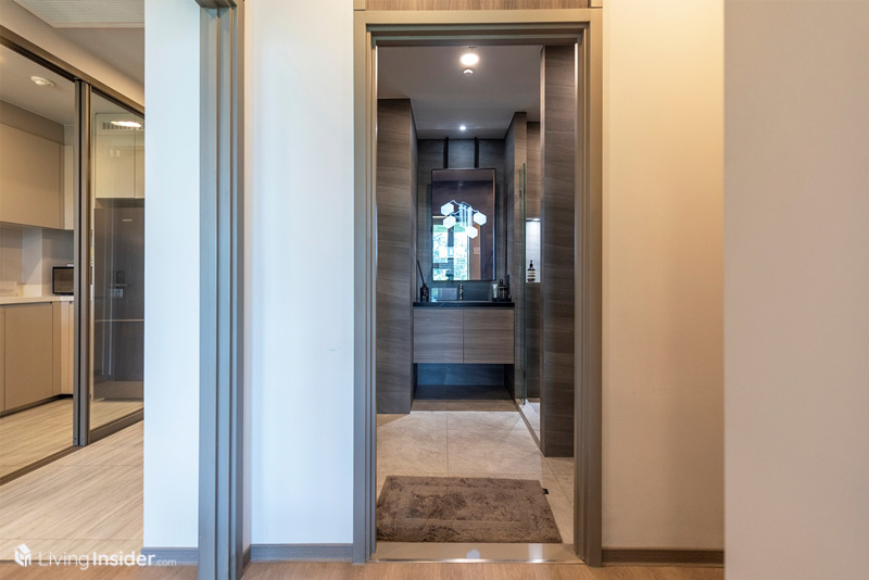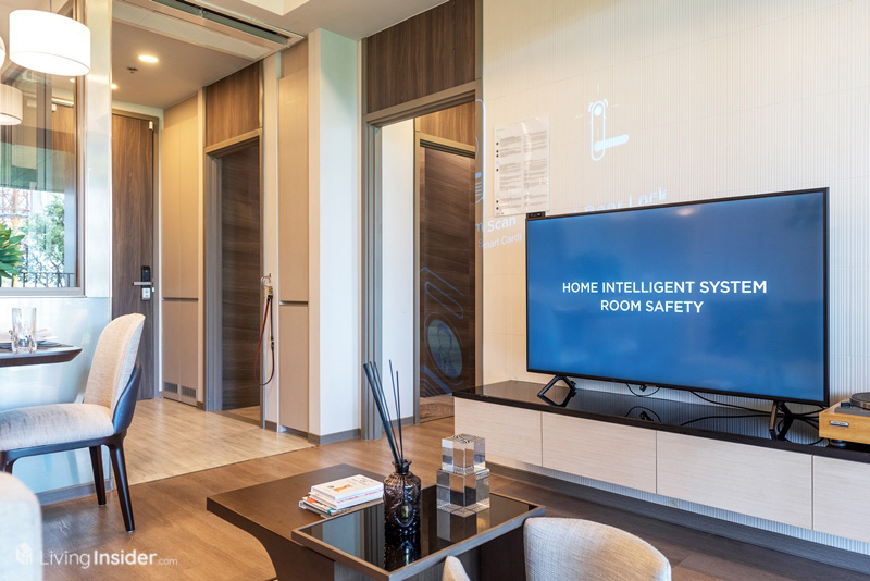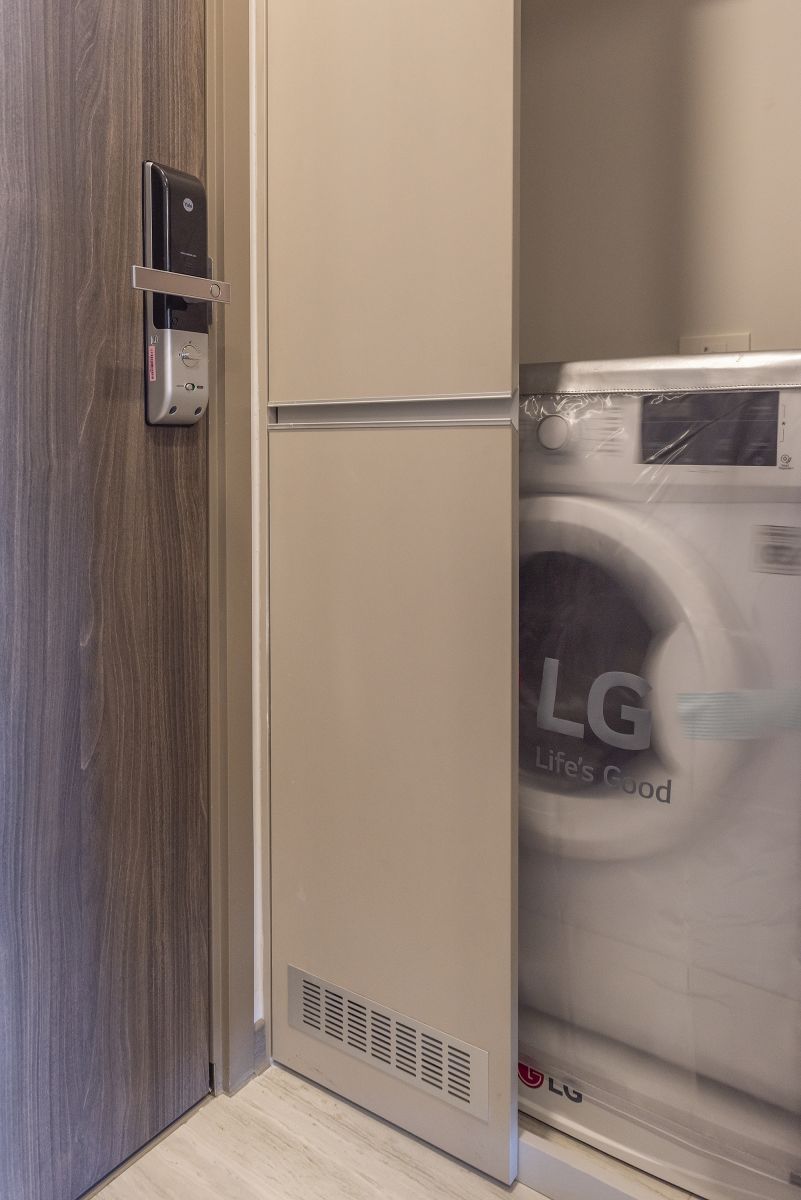 ทางโครงการมีห้องตัวอย่างให้ชม 1 ห้อง คือ ► 1 Bedroom ขนาด 43 ตารางเมตร ตั้งแต่นี้แนะนำว่าต้องตั้งใจอ่านเลย งานดีเทลงานละเอียดมีแทบจะทุกบรรทัดเลยจริงๆ เริ่มตั้งแต่หน้าประตู จะได้ Digital Door Lock พอเข้ามาแล้วซ้ายมือ จะเจอกับตู้ที่ไว้วางเครื่องซักผ้า โดยออกแบบท่อน้ำทิ้ง เพื่อให้ใช้งานกับระบบท่อออกหลังอย่างมีประสิทธิภาพ ซึ่งบริเวณทางเข้านี้ไฟจะเปิด-ปิดอัตโนมัติ
