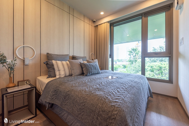 ขณะที่ ห้องนอน จะได้เป็นประตูทึบ เพื่อความเป็นส่วนตัวเวลามีเพื่อนหรือครอบครัวมาหา โดยจะเจอกับมุมแต่งตัว ซึ่งทางโครงการบิวท์อินตู้เสื้อผ้ามาให้เรียบร้อย และทางซ้ายมือจะเป็นประตูทางเข้าห้องน้ำ