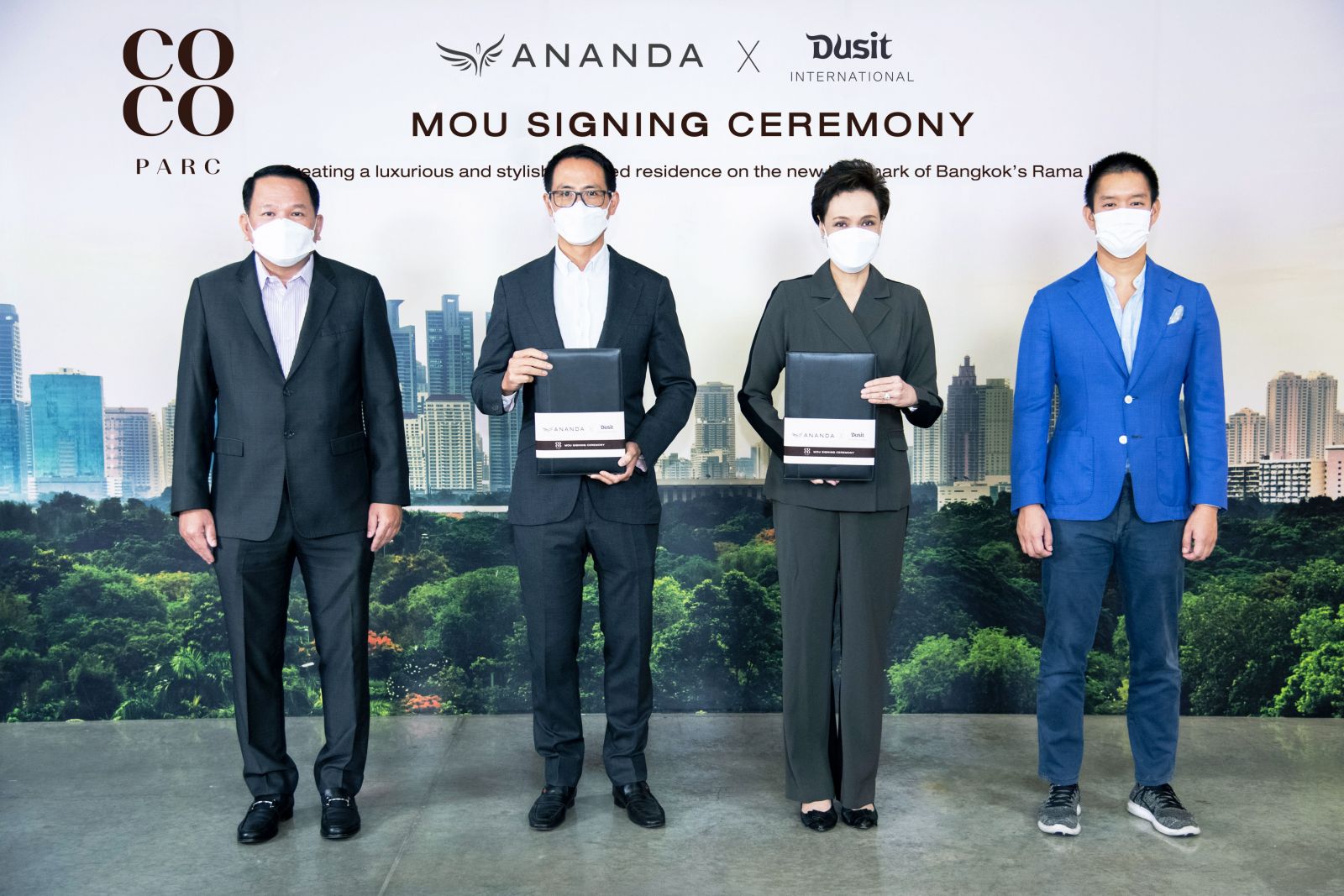 คุณชานนท์ เรืองกฤตยา (ที่ 2 จากซ้าย) ประธานเจ้าหน้าที่บริหาร และคุณประเสริฐ แต่ดุลยสาธิต(ซ้ายสุด) ประธานเจ้าหน้าที่บริหาร สายงานธุรกิจอสังหาริมทรัพย์ บริษัท อนันดา ดีเวลลอปเม้นท์ จำกัด (มหาชน) ร่วมกับ คุณศุภจี สุธรรมพันธุ์ (ที่ 2 จากขวา) ประธานเจ้าหน้าที่บริหารกลุ่ม และคุณศิรเดช โทณวณิก (ขวาสุด) รองประธานฝ่ายปฏิบัติการ บริษัท ดุสิตธานี จำกัด (มหาชน) ร่วมลงนามความร่วมมือภายใต้โครงการ COCO Parc Managed by Dusit Hospitality Services