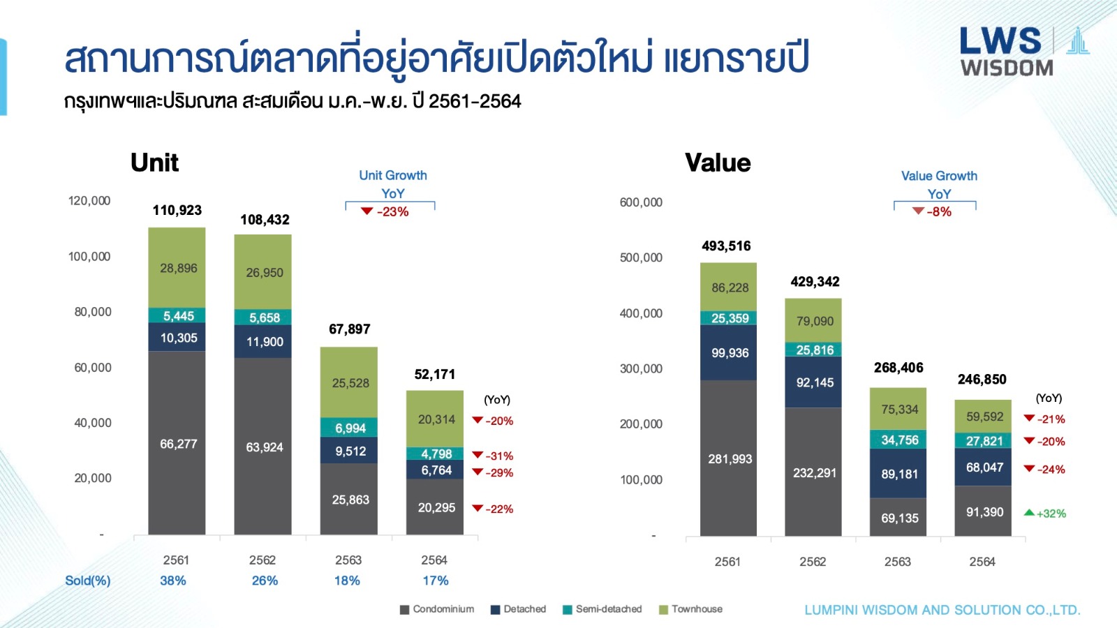 โดยตัวเลขการเปิดตัวโครงการใหม่ในเขตกรุงเทพฯ-ปริมณฑล ในเดือน มกราคม-พฤศจิกายน 2564 มีจำนวน 52,171 หน่วย ลดลง 23% เมื่อเทียบกับระยะเดียวกันของปี 2563 เป็นการเปิดตัวโครงการคอนโดมิเนียม 20,295 หน่วย มีอัตราการขายเฉลี่ยอยู่ที่ 23% และการเปิดตัวโครงการแนวราบ 31,876 หน่วย อัตราการขายเฉลี่ยอยู่ที่ 13%