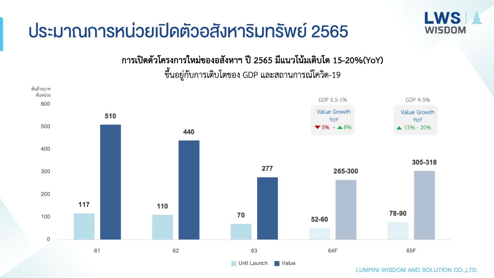 นายประพันธ์ศักดิ์ รักษ์ไชยวรรณ กรรมการผู้จัดการ บริษัท ลุมพินี วิสดอม แอนด์ โซลูชั่น จำกัด (LPN Wisdom หรือ LWS) บริษัทวิจัยและที่ปรึกษาในการพัฒนาอสังหาริมทรัพย์ในเครือบริษัท แอล.พี.เอ็น.ดีเวลลอปเมนท์ จำกัด (มหาชน) (LPN) กล่าวถึงแนวโน้มตลาดอสังหาริมทรัพย์ในปี 2565 ว่า ตลาดอสังหาริมทรัพย์ในปี 2565 มีแนวโน้มที่จะเติบโตประมาณ 15-20% ตามการคาดการณ์แนวโน้มเศรษฐกิจที่คาดว่าจะเติบโตประมาณ 3.5-4% ของธนาคารแห่งประเทศไทย(ธปท.) และสำนักงานสภาพัฒนาการเศรษฐกิจและสังคมแห่งชาติ(สภาพัฒน์)
