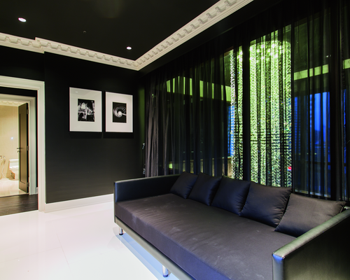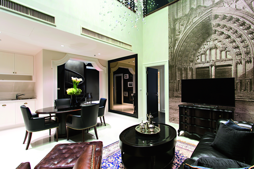 ห้องนี้ตกแต่งใหม่ทั้งหมดจนแทบไม่เหลือเค้าโครงเดิมให้เห็นหรือสามารถจินตนาการได้เลยว่าห้องนี้เดิมแล้วหน้าตาเป็นอย่างไร เพราะ ดร.นพพร พร้อมด้วยคุณเจี๊ยบ-ฐิตารีย์ อ่องแสงคุณ อินทีเรียดีไซเนอร์ เลือกที่จะผสานความขรึมเข้มราวกับห้องแดร็กคูล่าเข้าด้วยกันกับความหรูหราและคลาสสิกที่เผยโฉมให้เห็นอยู่ในทุกอณูของห้อง ผนังกระจกปกคลุมด้วยผ้าม่านขรึมดำทำให้ห้องนี้ลึกลับน่าค้นหา โดยมีพื้นที่ระหว่างห้องครัวกับห้องนั่งเล่นเป็นเสมือนไนต์คลับส่วนตัว ซึ่งออกแบบมาไว้สำหรับการจัดปาร์ตี้ที่รองรับคนได้จำนวนมาก