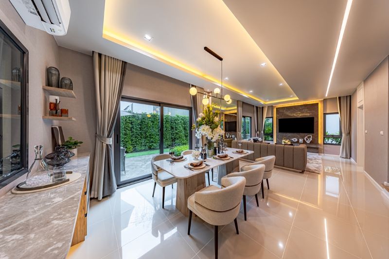 เริ่มด้วย Living Space ขนาดใหญ่ เชื่อมต่อไปยัง Dining Space รองรับโต๊ะทานอาหารขนาดใหญ่ 4–6 ที่นั่ง ผนังกระจกบานใหญ่พร้อมกระจกตัดแสงรอบตัวบ้านทั่วทั้งห้อง ช่วยให้บ้านสว่างและเชื่อมต่อกับธรรมชาติได้อย่างลงตัว ห้องครัวแยกสัดส่วน