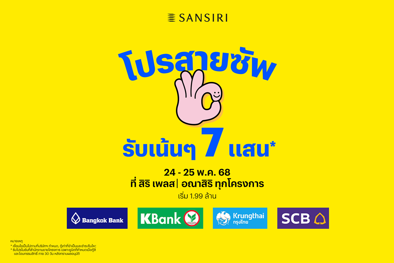 แสนสิริเตรียมจัดบิ๊กอีเวนต์ #โปรสายซัพ เพียง 2 วัน คือวันที่ 24-25 พฤษภาคม 2568 นี้ เพื่อช่วยเหลือให้ลูกค้าที่อยากมีบ้าน สามารถเป็นเจ้าของบ้านได้ง่ายขึ้น โดยแสนสิริได้ทำการบ้าน และรวบรวมโปรโมชันที่ตอบโจทย์ลูกค้าในทุกสภาวะการเงิน จากนั้นได้ร่วมกับพันธมิตรสถาบันการเงิน 4 แห่ง (ธนาคารกรุงเทพ ธนาคารกรุงไทย ธนาคารกสิกรไทย และธนาคารไทยพาณิชย์) ร่วมด้วยโปรสายซัพ อยากมีบ้านไม่ต้องลุยคนเดียว