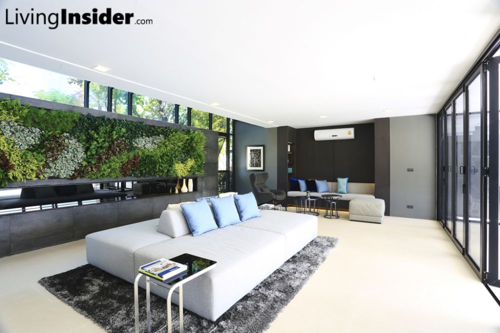 ตัวบ้านออกแบบพื้นที่ห้องนั่งเล่นให้เป็นห้องที่เปิดรับช่องแสงมากที่สุด และเป็นพื้นที่ที่มองเห็นทุกส่วนของบ้าน ได้ความรู้สึกว่าบ้านโล่งและกว้างมาก