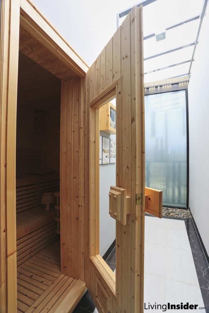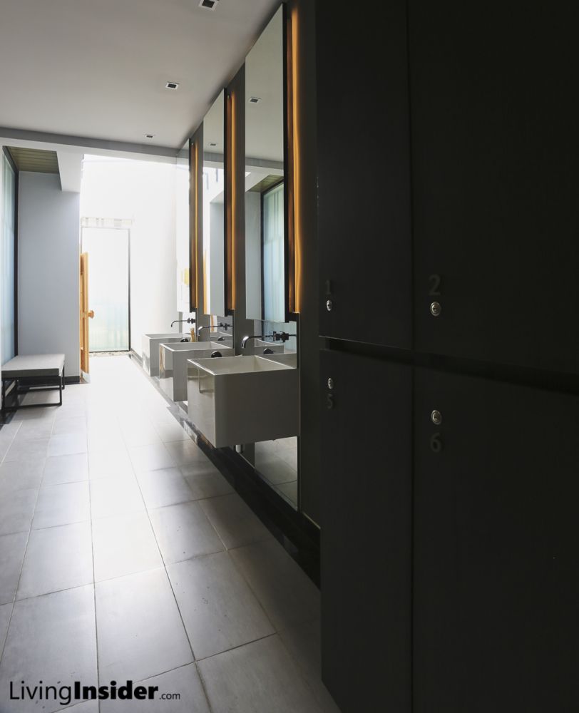 ฟังก์ชันภายในห้องน้ำก็เพียบพร้อมทั้งตู้ล็อคเกอร์ อ่างล้างมือ กระจก และห้องซาวน่า ทุกอย่างดูทันสมัย สวยงามน่ามองไปหมด